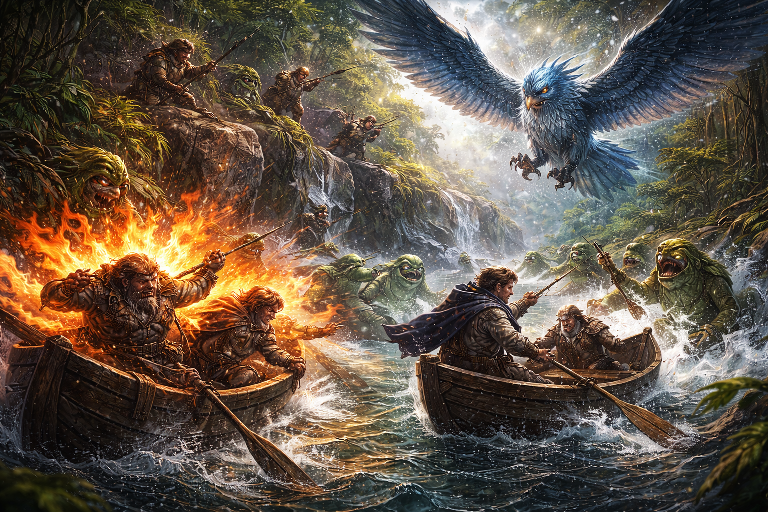 At the docks, a well-dressed half-orc approached and formally welcomed the party, inviting them into the city halls. However, to safely pass through the surrounding island terrain and reach Flint Outpost, they would require a guide. They were assigned Jimbo Reefclaw, a triton familiar with the island’s waterways. The group traveled by rowboat along a rough, winding river. Mid-journey, they were ambushed: bullywugs attacked from the water while bandits rained arrows from the cliffs above. During the chaos, Red Flint and Juulia Troski accidentally triggered an explosion that destroyed their rowboat. Before disaster struck, Jimbo transformed into a large bird and rescued them. After defeating both the bullywugs and bandits, the group regrouped in the remaining boat. They finally reached shore safely, where a cave entrance awaited them, the final passage leading toward Flint Outpost.