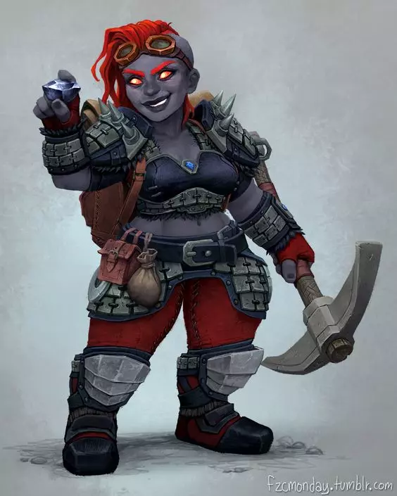 Gemri Rustheart is a duergar scavenger who trawls dangerous locations for rare materials and objects which she can sell to the highest bidder. She is accompanied on her expeditions by a canine construct named Rusty.