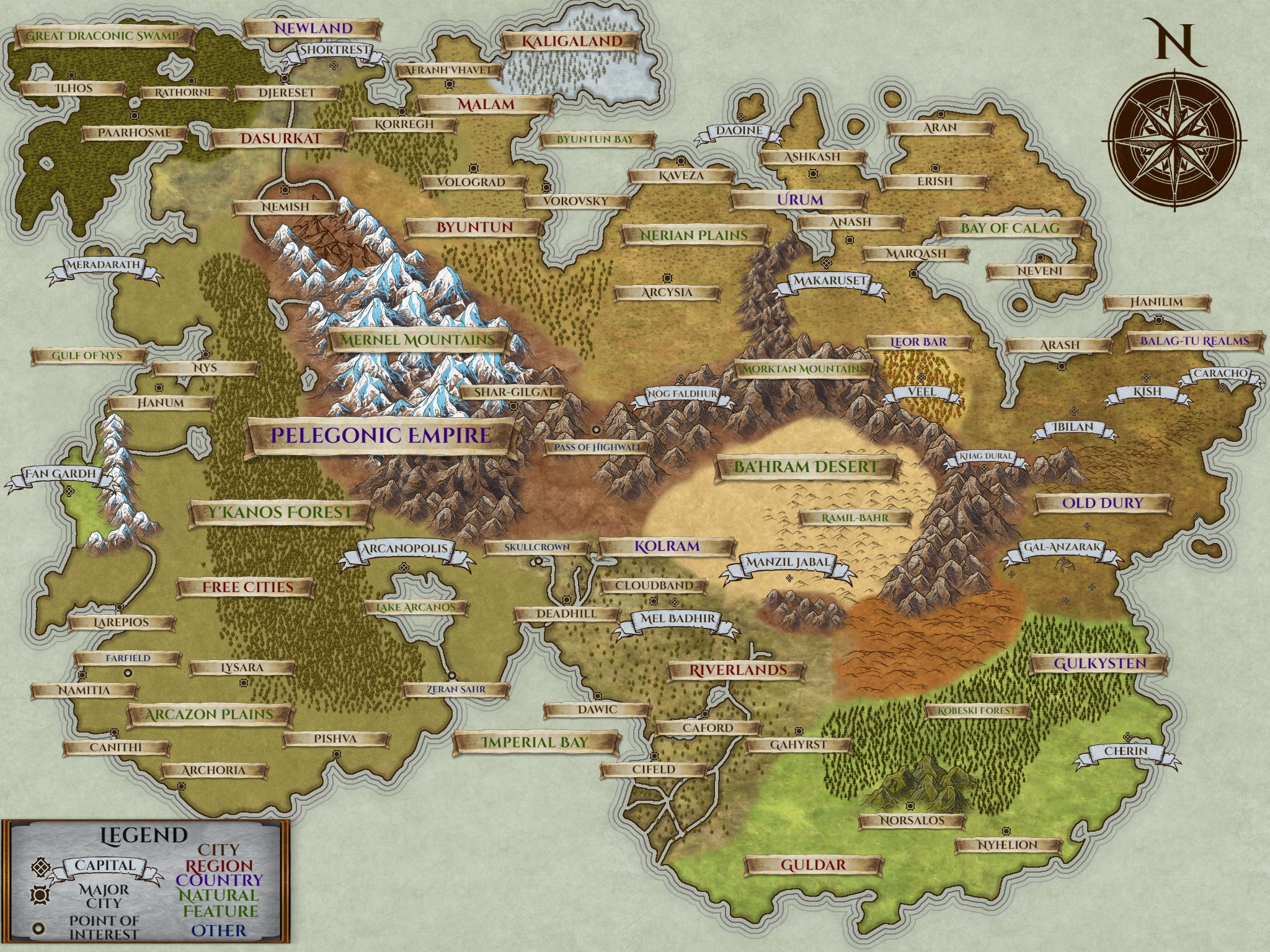 Yekare is the largest and principal continent of El-Bayir. Expansive and diverse, Yekare is home to a variety of peoples and nations. It is a fairly urbanized continent, with most of the world’s largest cities being located in Yekare. Politically, the continent is currently dominated by Pelegon, a large feudal empire which covers most of the continent’s landmass.