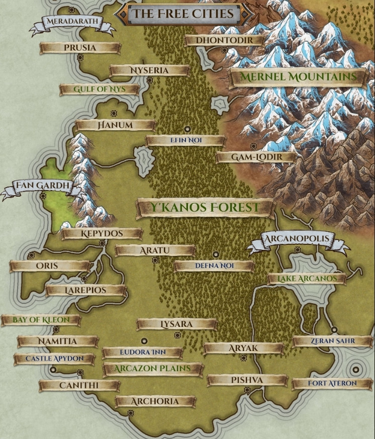 The Free Cities are a region on the western coast of Yekare comprised of several independent city-states, most of which were founded as Kardunashi colonies. Similarly to the Motherlands, the Free Cities are politically disunited and frequently squabble with one another. However, unlike the River Kingdoms, the Free Cities are far more stable and "lawful" in their governance. The cities are predominantly governed as oligarchic republics or hereditary constitutional monarchies.