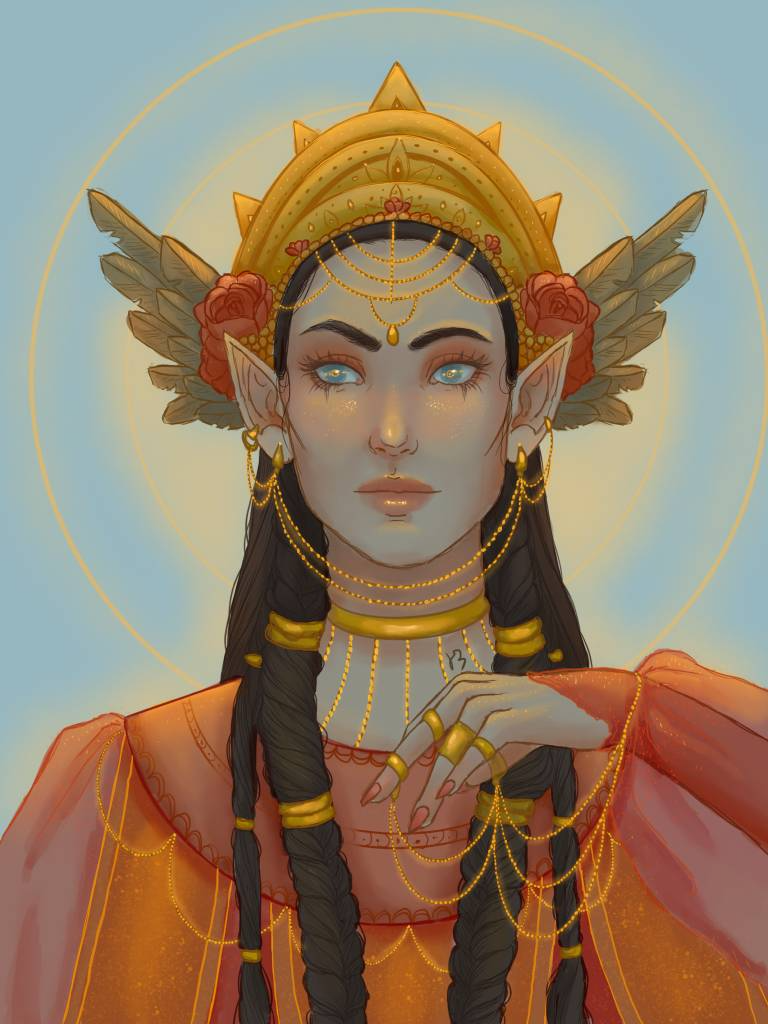 Gilris is a powerful angel in service to Beld. She was sent to the Coast of Starlight to await the arrival of Sylvanion and his Elves, help them settle the region, and guide them how to thrive. However, she and Sylvanion ended up falling in love and were married in his new realm. Since their marriage, she has also been the Queen of Fangardh. Having lived in Fangardh for several millennia, and being an angel herself, Gilris is counted amongst the wisest of all beings in the World and has several children.