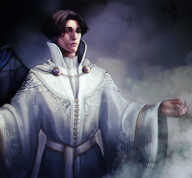 As his conquests began, Pelegon took to wearing flowing silken robes of blue and grey and had a complex veiled crown forged. He wore necklaces of religious charms and prayer stones which jingled while he walked. His eyes were originally brown, but in one battle he was struck down and his eyes removed by an enemy bannerman. In the first of many interventions by Odion Himself, the God appeared before Pelegon and gave him white eyes imbued with the power of truesight.