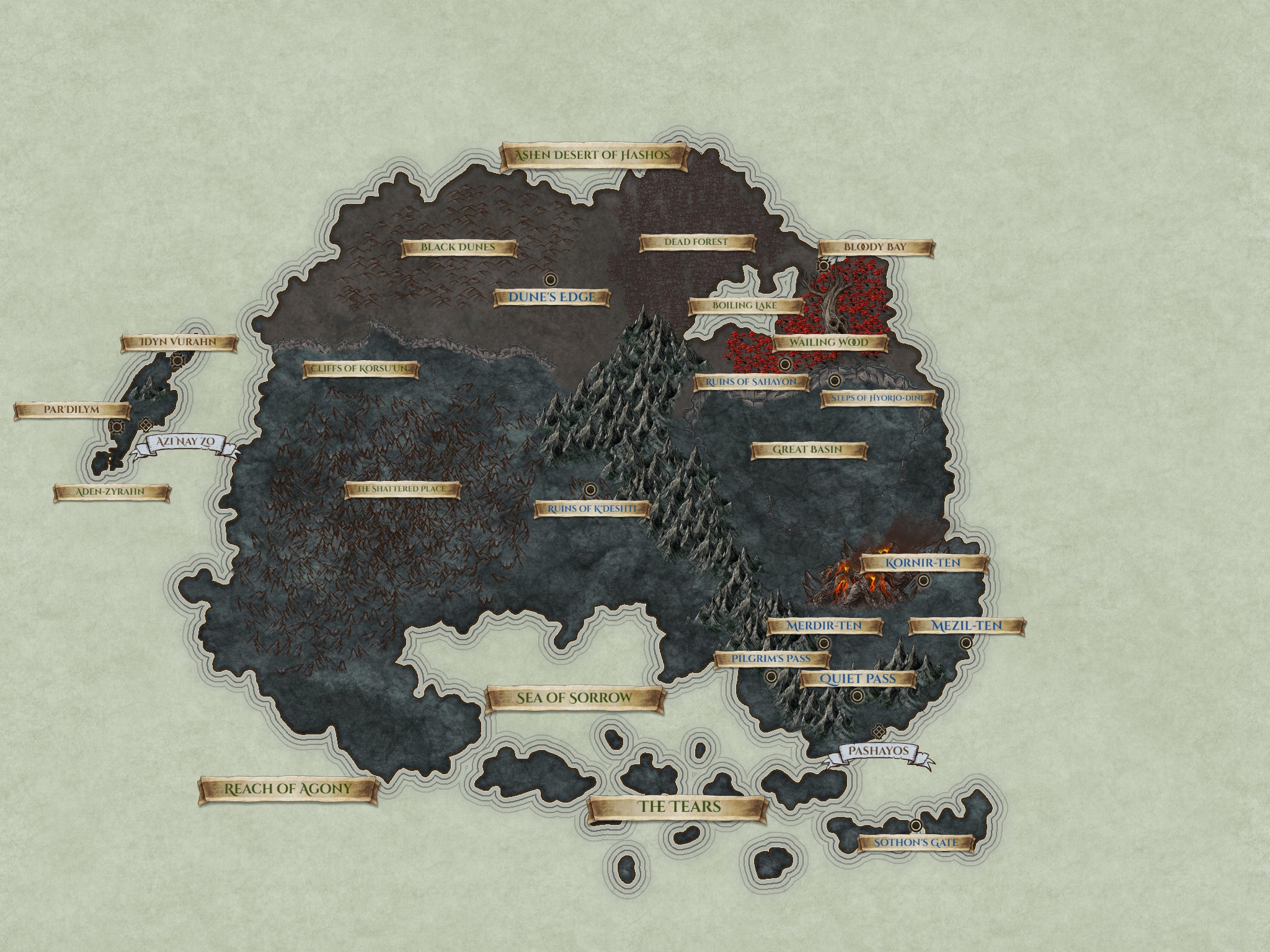 The Shadowlands can be roughly divided into two great regions. The northern Black Wastes are a vast desert of ash and rock, nearly inhospitable. The southern Silver Lands are more hospitable, dominated by various silvery plants and home to the only inhabited cities on the continent: Pashayos and Marqhabash.