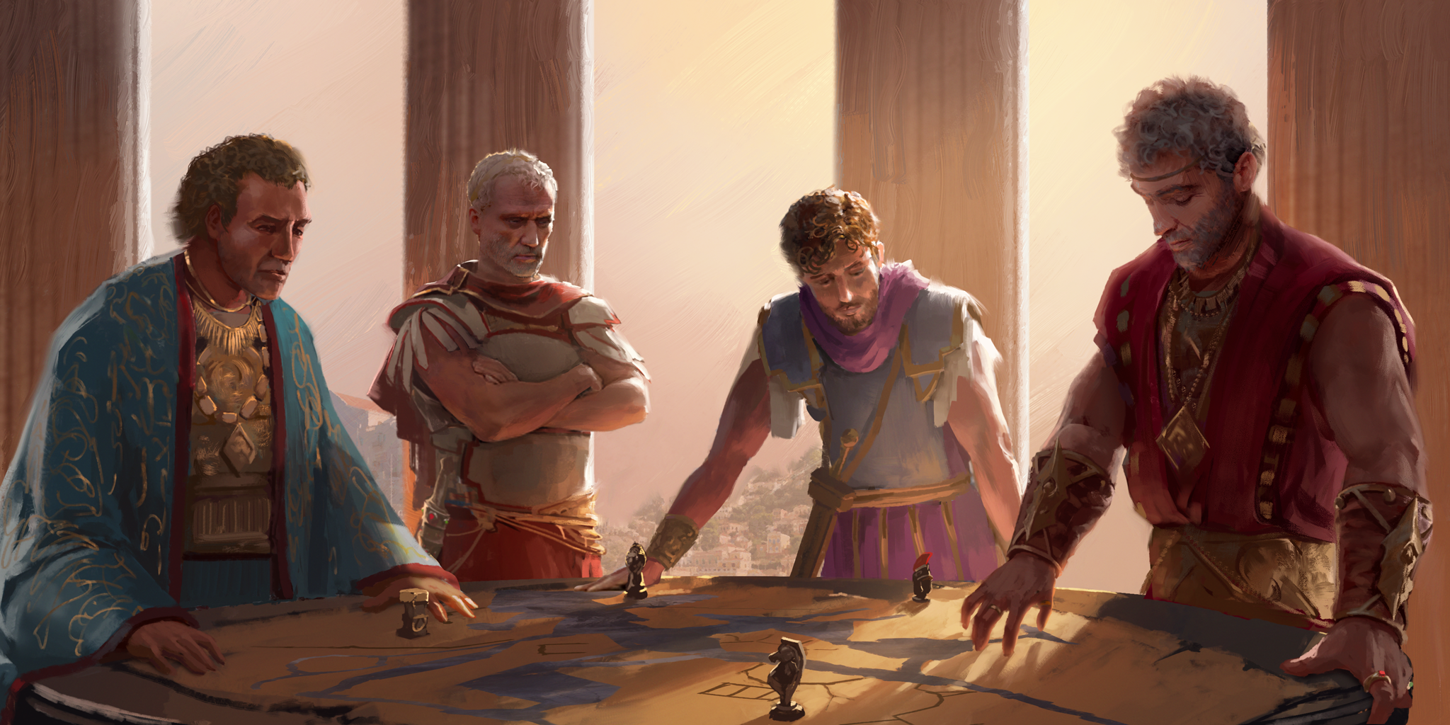 Four men of different ethnicities look over a map. Left to right, they are: Meradareen, Kardunashi, Kaduir, and Notoshi