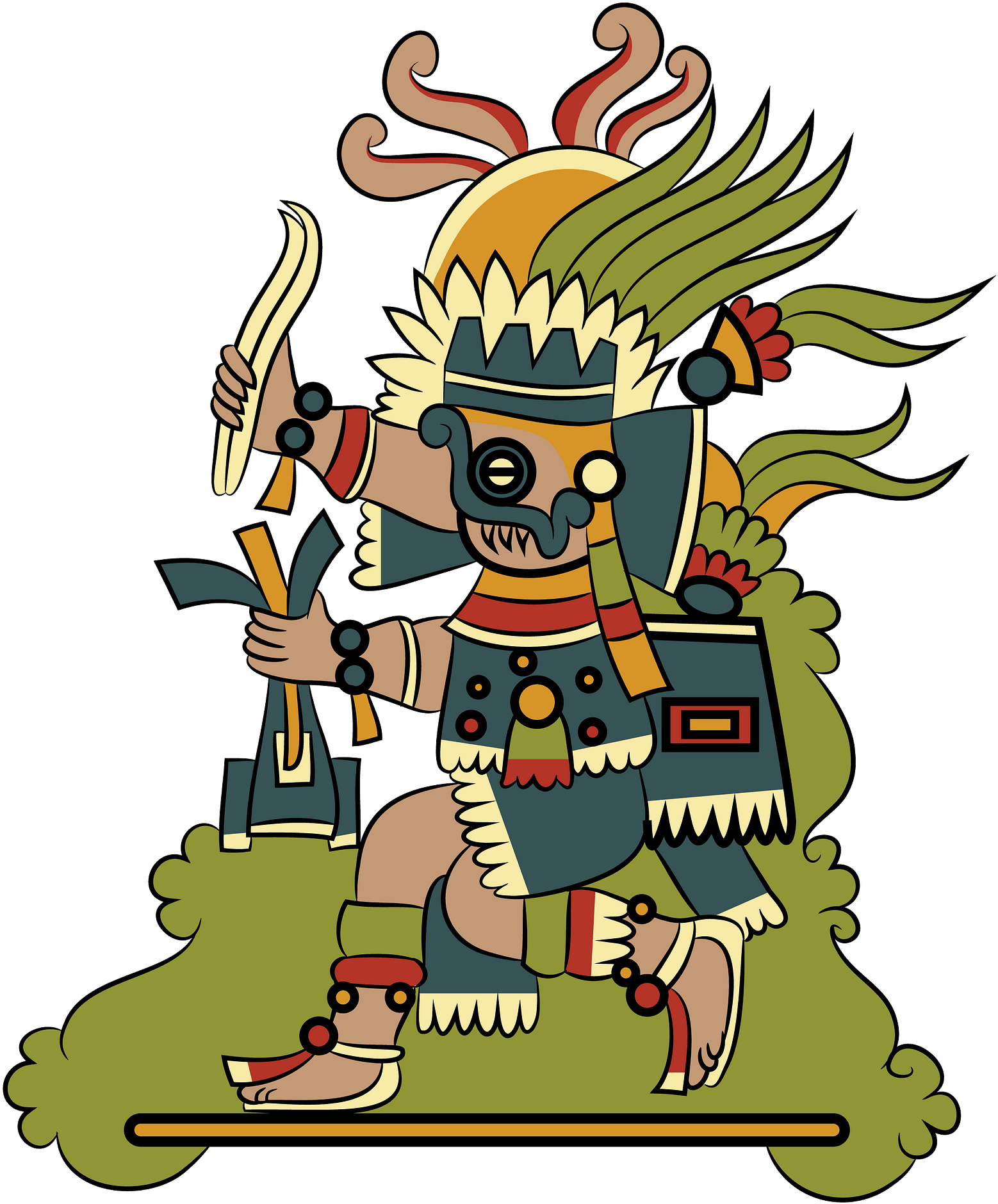 The Emperor of Ticemehua wears an elaborate crown made from bright green bird's feathers. The title Tlahtoani (king) literally translates to "One Who Dons the Feathers"