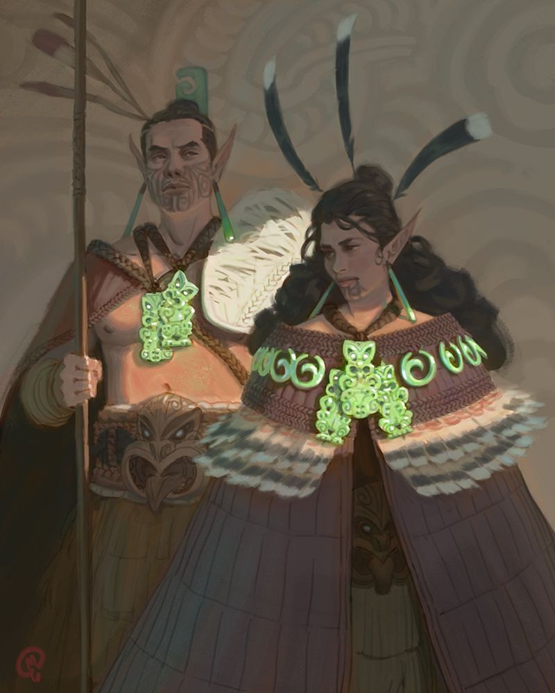 The Jade Elves are an Oboyani Ethnicities of Wood Elf native to the southern Jade Isles. The Jade Elves are known for their cultural affinity for jade. The Jade Isles are rich in the mineral, and the Jade Elves have developed arcane smithing techniques which allow them to shape jade into weapons, armor, and tools on par with the metal that is more typically used in other parts of the world. The Jade Elves worship He of Earth, calling Him the Father of the Isles, Airon, and Weer. Besides their gemcraft, the Jade Elves are also master sailors and accomplished traders. Ancient sources describe Jade Elf double-sailed canoes traversing the seas as far as the lands of the Kammikan and Balag-tu in the second millenium of the Fourth Age and Jade Elf jewelry is highly prized across the world for its quality, craftsmanship, and perceived health benefits.