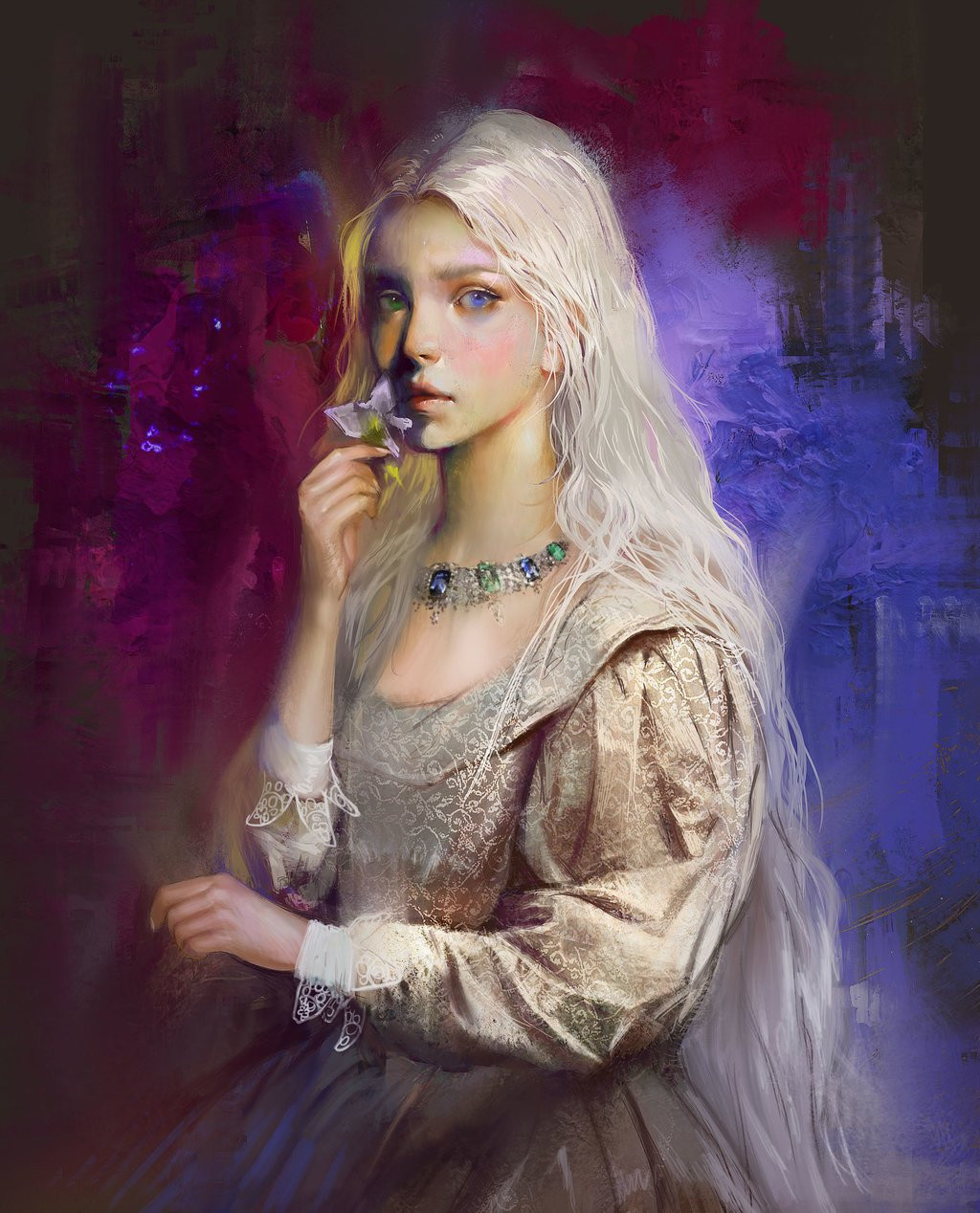 Vivinnia was renowned for her beauty. Her hair was silver-blond, which led some to speculate that she was somehow related to House Pelegon, though there was no proof of this. She was most known for her mismatched eyes. One was a deep blue, and the other was emerald green.