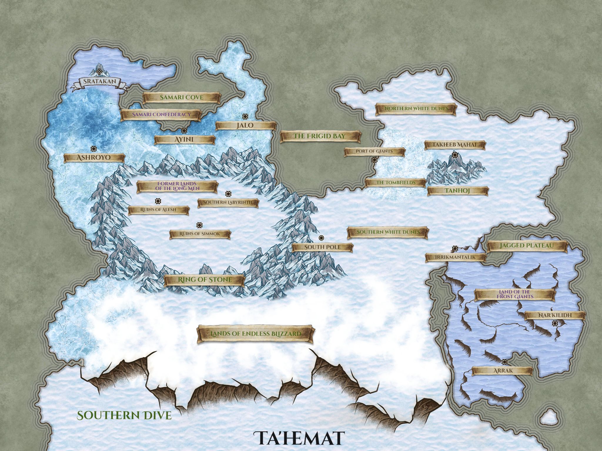 In the southernmost part of the world is the frigid, barren, and snowswept continent of Hatmagal. It is sparsely inhabited. On the coast are the Samari, mysterious icy peoples who tell oral histories of a great inalnd empire in a bygone era of warmth and greenery. On the jaggedplateau are the Frost Giant, a very mysterious and reclusive people.