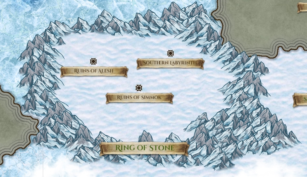 The Ringlands are the lands encircled by the Ring of Stone. They were once the lands of the Tall Men, though they are now largely abandoned, populated by silent ruins, dangerous beasts, and the mysterious Southern Labyrinth.