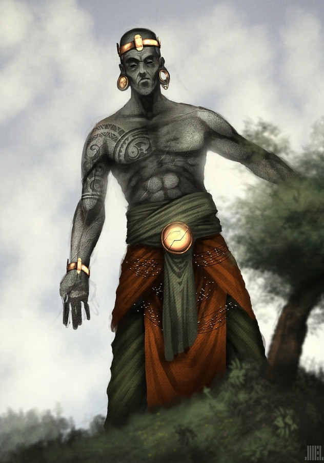 Stone Giants are a race of Nephilim who today inhabit various mountaintops and rocky areas. Stone Giants are the most commonly seen of the Giants, as they live closest to the places of the world which are inhabited. Some Stone Giants have mutualistic relationships with neighboring villages and communities. In Nor'kosh'ti, the Stone Giants call themselves the Krohkt'mai-zar, meaning "Stone Walkers."