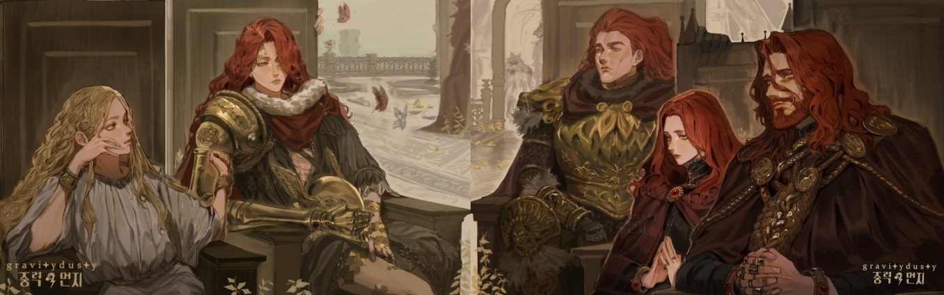 Notably, Unknown and Unknown are absent from the painting. The reason is unknown but it is believed that this may be because they were not present in the capital when it was painted. It is known that Sethen was a wandering adventurer, rarely coming to K'deshti, and Methusulon was as mysterious in the First Age as he is in the current day.