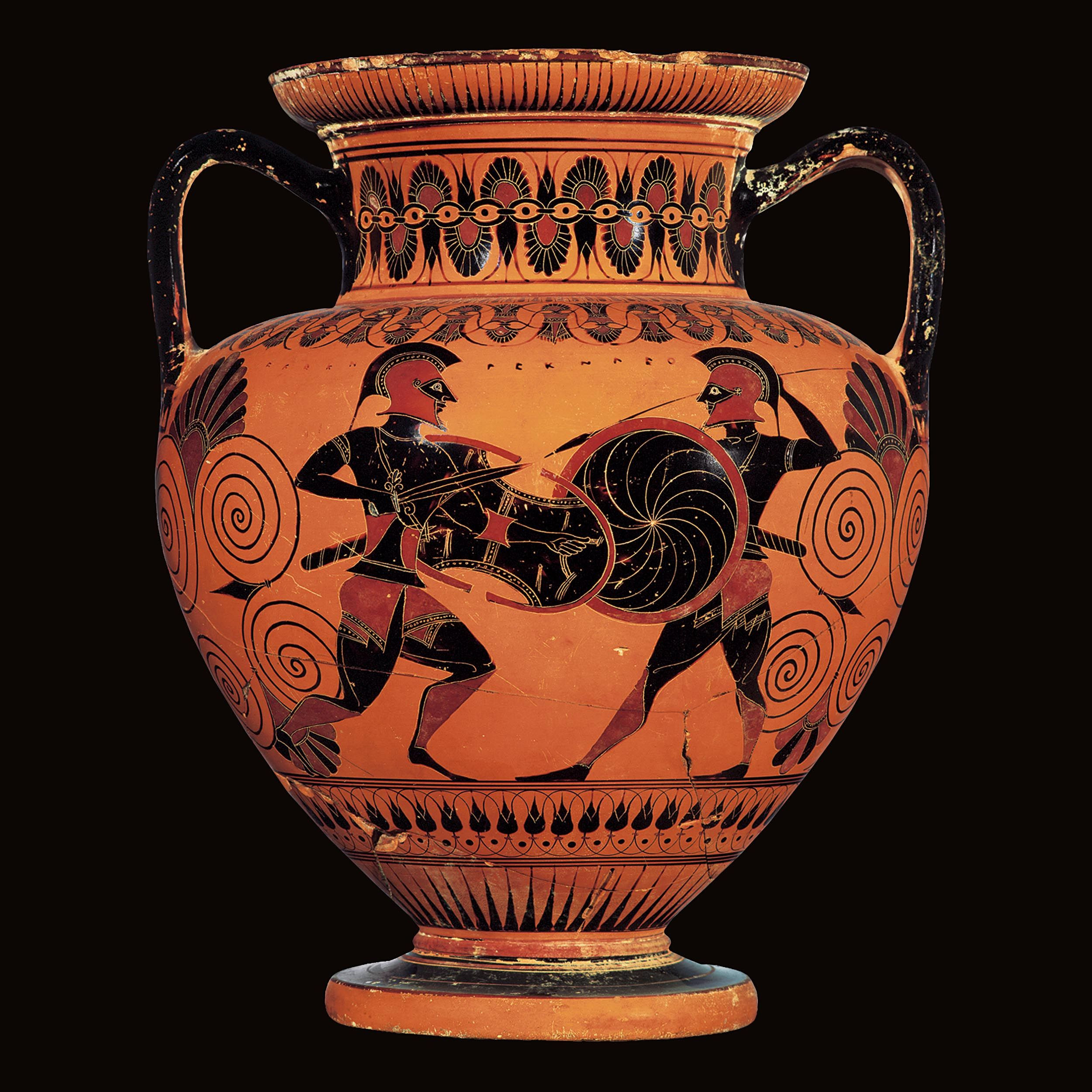 Kardunashi painted vase depicting a Kardunashi hoplite (right) in combat with a Meradareen swordsman (left)