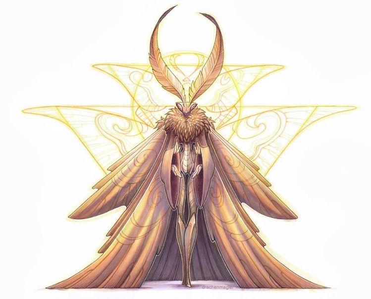 The L'panim resemble humanoid moths of otherworldly beauty. They have four arms, two legs, and long antenna. They are immensely wise, immensely powerful in magics, and considered to be near-godlike in their abilities and powers. In times past, L'panim cities dotted the whole primordial world, but now their cities are so far gone as to be below even the Underdark.