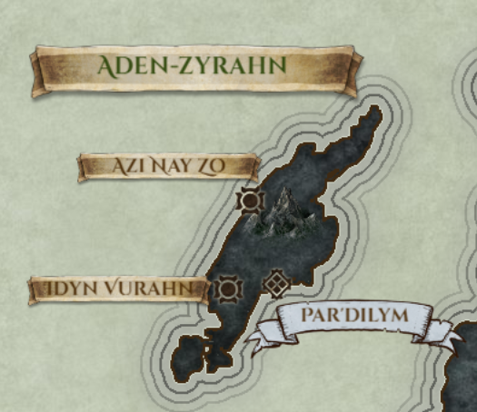 Aden-zyrahn is the island nation of the Tall Men located just off the coast of the Shadowfell. The island is shrouded in storms, according to sailor's tales these storms are summoned by Tall Men sorcerers to keep their island hidden from even the other Shadowfolk. Like much of the Shadowfell, the land of Aden-zyrahn is burnt black and impossible to farm traditional crops in.