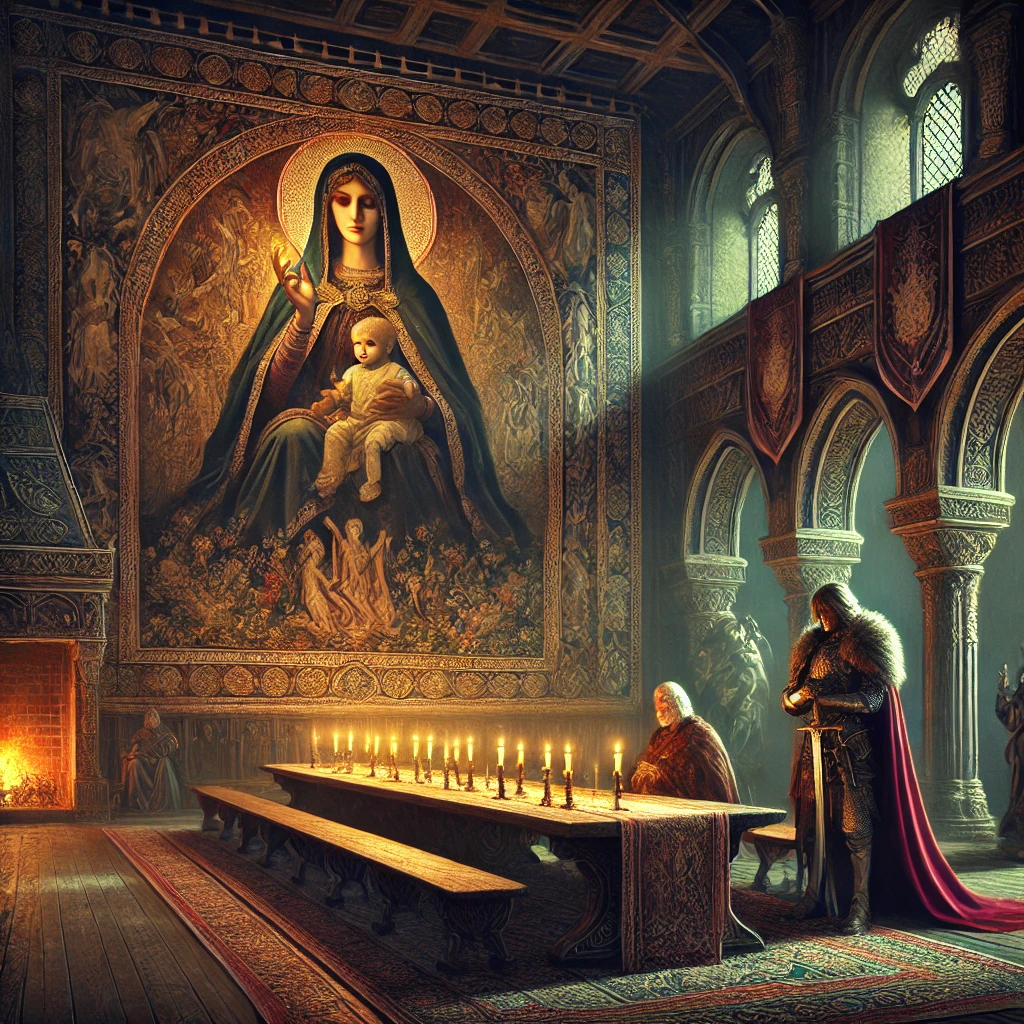 Ledril, beset with grief, commissioned a tapestry depicting his gentle wife ministering to the sick. Finished about a year later, the tapestry was hung in the great hall, where it hangs to this day. On the first anniversary of Torlyne’s murder, her pale face took on a red tinge, and this strange occurrence has repeated each year since, for two and a half centuries.