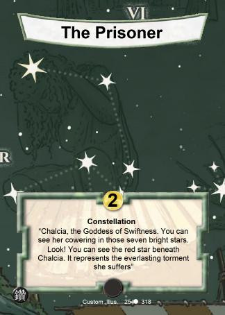 "Chalcia, the Godess of Swiftness, was the only god to escape when her siblings, Sydon and Lutheria, decided to destroy their brothers and sisters. She escaped to an island of fire, pursued by Sydon's storm of wrath. She hid deep in the island and waited for the storm to abate. You can see her cowering in those seven bright stars.