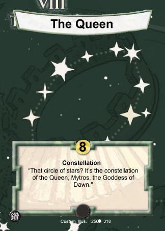 "That circle of stars? It's the constellation of the Quees, Mytros, The Goddess of the Dawn. Some say those stars form a crown, signifying her status as Queen of the The Five Gods. Others believe the stars represent the walls of a fortress, or the outline of a shield, for Mytros protects us from the ravages of the Titans."
