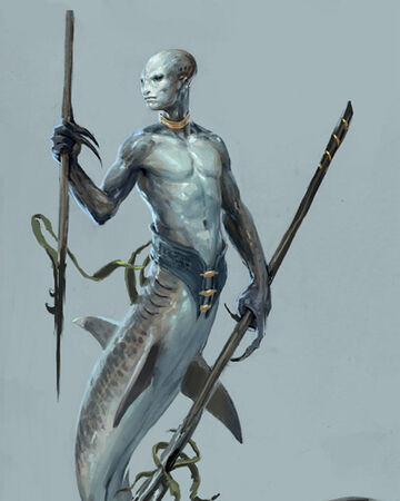 Adaros are frightful creatures with the upper bodies of muscular humanoids, the lower bodies of sleek sharks, and enormous jaws filled with razor-sharp teeth. Nomadic predators of the deep, adaros travel in packs through tropical waters, hunting their prey with poisoned spears and then devouring the victims raw. Adaros willingly feed on humans, merfolk, and other sentient creatures.