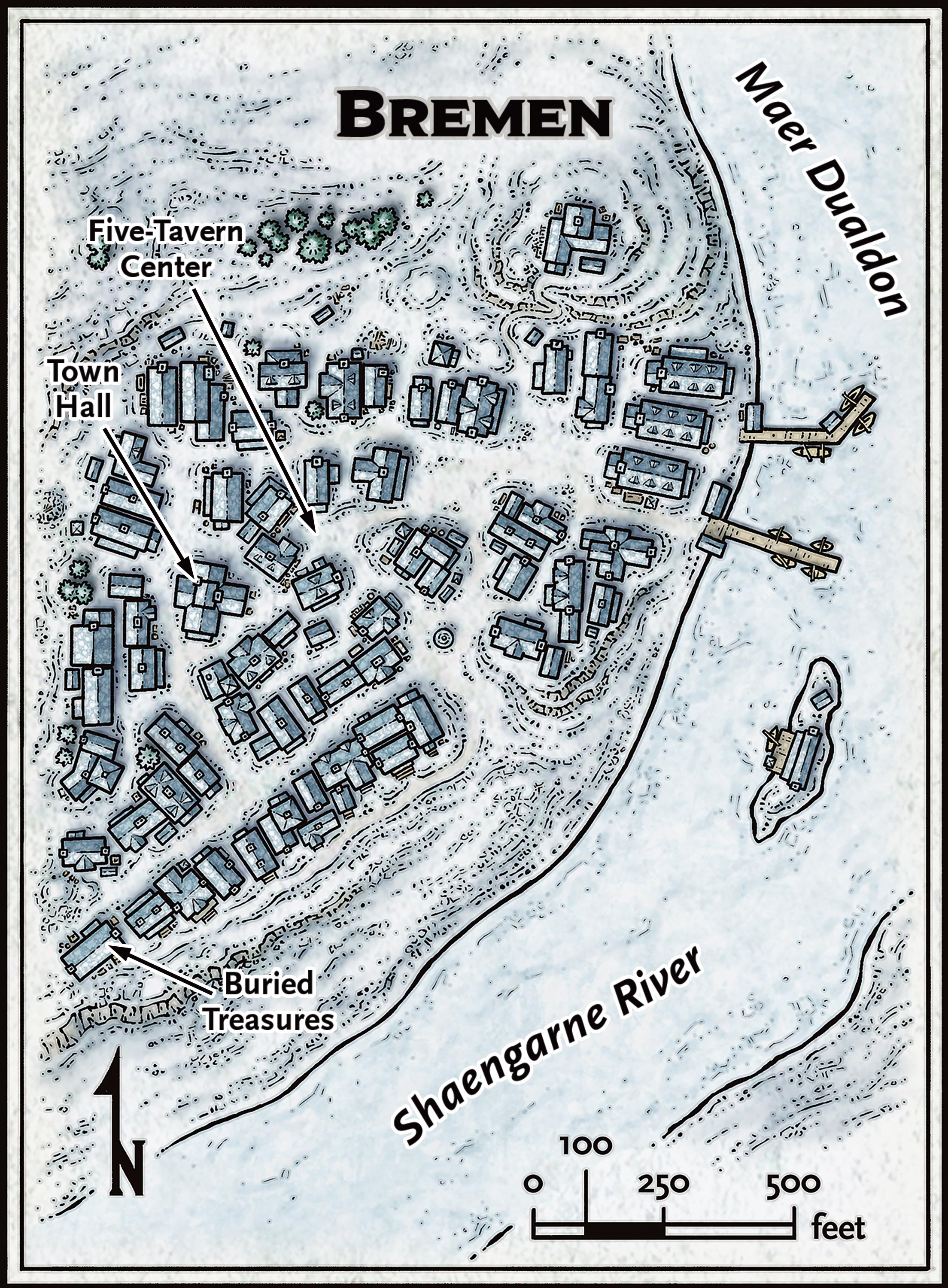 Five taverns stand in a semicircle around a central yard in the heart of Bremen: The Black-Bearded Brother, Stones, The River's Mouth, Even Keel, and The Grumpy Moose.