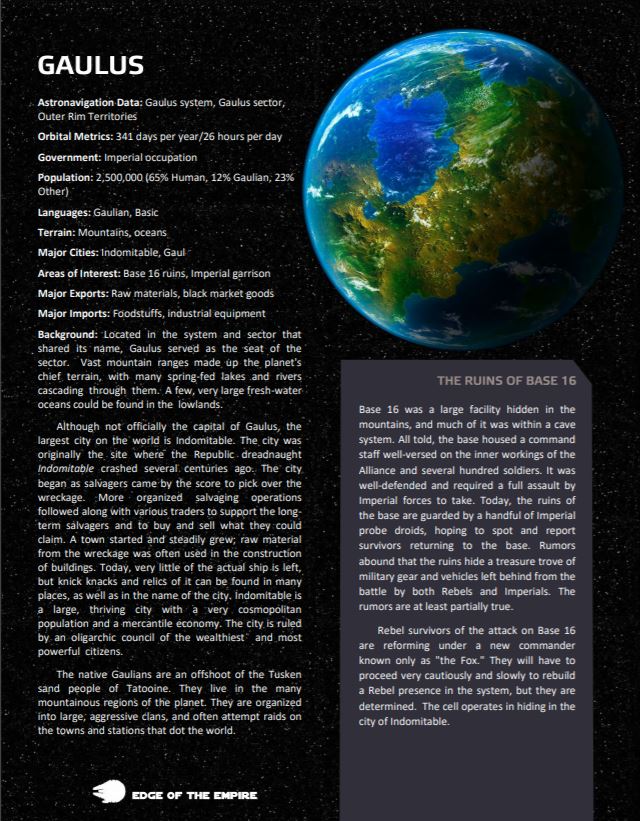 Background: Located in the system and sector that shared its name, Gaulus served as the seat of the sector. Vast mountain ranges made up the planet's chief terrain, with many spring-fed lakes and rivers cascading through them. A few, very large fresh-water oceans could be found in the lowlands. Although not officially the capital of Gaulus, the largest city on the world is Indomitable. The city was originally the site where the Republic dreadnaught Indomitable crashed several centuries ago. The city began as salvagers came by the score to pick over the wreckage. More organized salvaging operations followed along with various traders to support the longterm salvagers and to buy and sell what they could claim. A town started and steadily grew; raw material from the wreckage was often used in the construction of buildings. Today, very little of the actual ship is left, but knick knacks and relics of it can be found in many places, as well as in the name of the city. Indomitable is a large, thriving city with a very cosmopolitan population and a mercantile economy. The city is ruled by an oligarchic council of the wealthiest and most powerful citizens. The native Gaulians are an offshoot of the Tusken sand people of Tatooine. They live in the many mountainous regions of the planet. They are organized into large, aggressive clans, and often attempt raids on the towns and stations that dot the world.