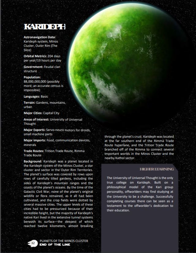 Background: Karideph was a planet located in the Karideph system of the Minos Cluster, a star cluster and sector in the Outer Rim Territories. The planet's surface was covered by rows upon rows of carefully tilled gardens, including the sides of Karideph's mountain ranges and the coasts of the planet's oceans. By the time of the Galactic Civil War, none of the planet's original wildlife or flora remained, as it all had been cultivated, and the crop fields were dotted by several massive cities. The upper levels of these cities had to be pressurized because of their incredible height, but the majority of Karideph's native Kari lived in the extensive tunnel systems beneath its surface—the deepest of which reached twelve kilometers, almost breaking through the planet's crust. Karideph was located at the far southern end of the Rimma Trade Route hyperlane, and the Trition Trade Route branched off of the Rimma to connect several important worlds in the Minos Cluster and the nearby Kathol sector.