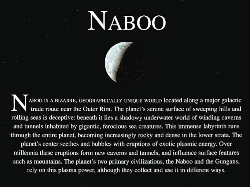 "Naboo represents the best of the Old Republic." ―Leia Organa, to Queen Sosha Soruna[src] Naboo was a bountiful planet in the Chommell sector of the Mid Rim, close to the border of the Outer Rim Territories. It was home to the Gungan species and to a population of humans known as the Naboo. Naboo was pushed to the forefront of galactic politics as the birthplace of the Dark Lord of the Sith Sheev Palpatine, who served as its representative in the Senate of the Galactic Republic. Under the guise of his Sith title Darth Sidious, Palpatine secretly engineered an invasion of his peaceful homeworld by the Trade Federation in a bid for power. Ostensibly done in protest over proposed taxation of formerly free trade routes, the Federation's invasion led to an outpouring of support from the Senate for both Palpatine and the newly-elected Queen of Naboo, Padmé Amidala. Amidala led a successful resistance movement and removed the Federation from her world during the Battle of Naboo. Palpatine subsequently rose to the office of the Supreme Chancellor of the Republic, with Amidala eventually taking his place as the planet's senatorial representative. Naboo would commit itself firmly to democracy in the intervening years, staying loyal to the Republic during the pan-galactic Clone Wars, which saw several military engagements against the Confederacy of Independent Systems come to the planet. By the time of the war's end, Palpatine had amassed considerable power and proclaimed himself the head of a new Galactic Empire. Palpatine's reign would eventually be ended by the Alliance to Restore the Republic, a rebel movement led by Amidala's children, Leia Organa and Luke Skywalker. Despite his origins on the planet, Palpatine did not care at all for his homeworld and, following his death, Naboo was named a priority target for Operation: Cinder, a protocol that the Sith Lord had put in place to destroy Imperial worlds should they fail to protect their Emperor. Through the intervention of Organa and Queen Sosha Soruna, however, Naboo was spared from ruin and went on to become a member of the successor state to the Alliance, the New Republic.