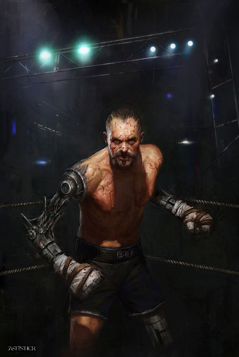 Ben is known for battering opponents with both of his cybernetic arms, he is rumored to be in debt due to getting them done. Word count: 24