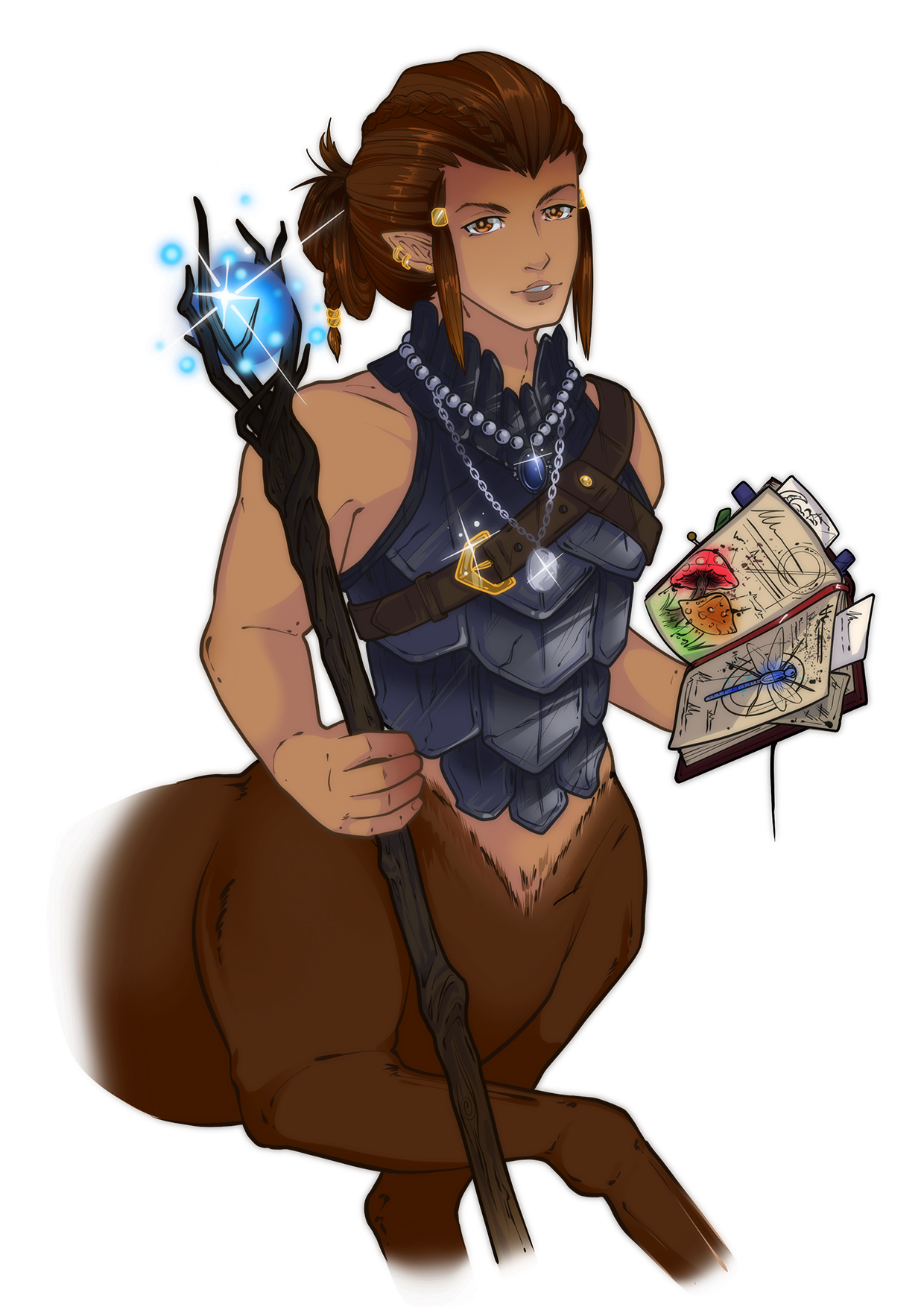 Hippofilius seems smaller and lighter on his feet compared to many of his kin. His upper body is lean and weathered from years living from the land, with shoulder-length brown hair tied loosely back across his shoulders. His horse-like lower body is lean, like a racing destrier, more slender than the warrior raiders of his home, with long coltish legs. His fur is a deep chestnut brown, lightening to pale white by his hooves.