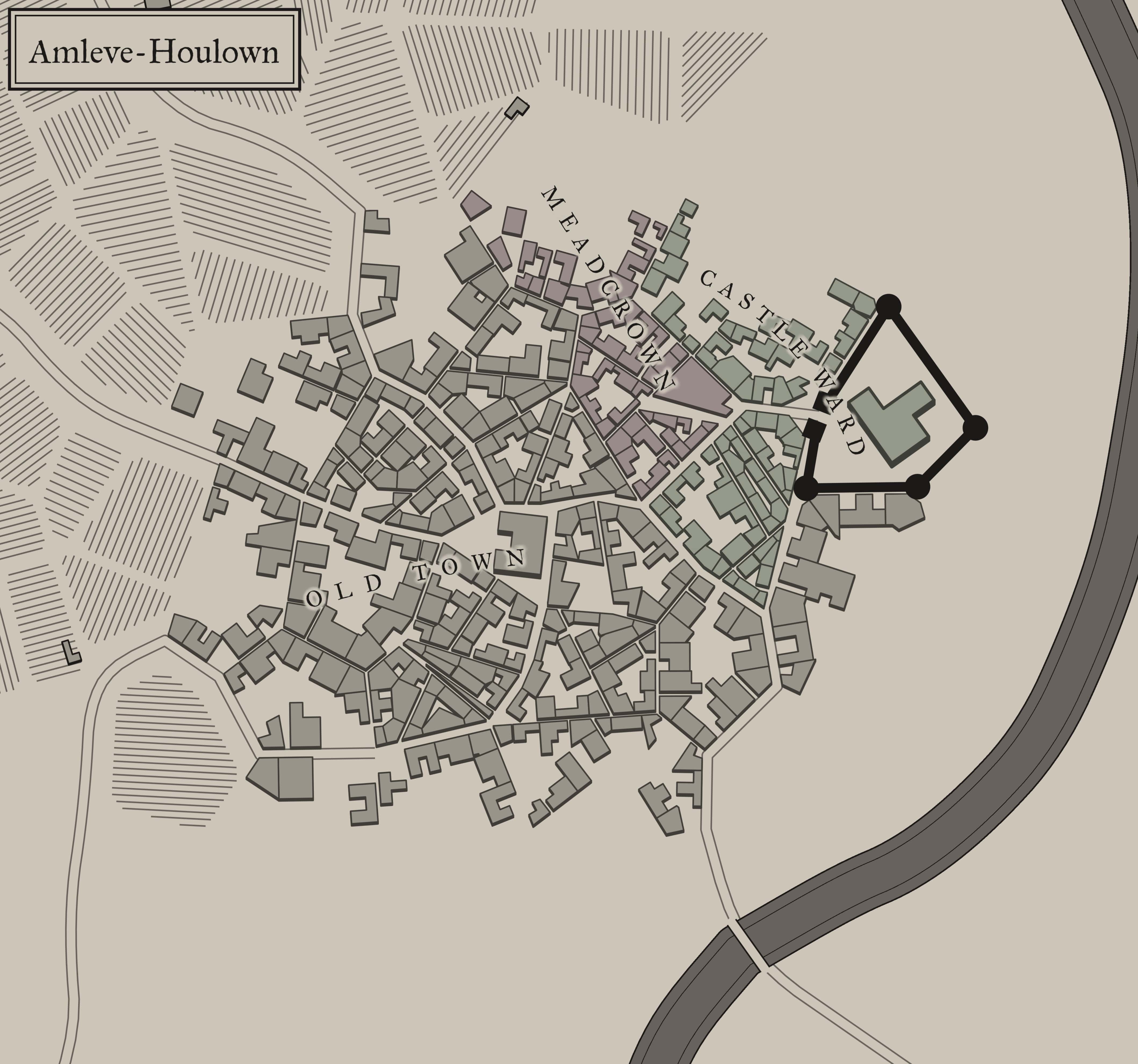 Amleve-Houlown is a smaller town within the Presia Shire of the Treaqusite Kingdom. As a town, it works as a trading hub between the Ponlandian Empire and the Treagusite Kingdom. Didehall is the next town that the Giants are making a stop at as they are completing the right to begin the next era after defeating the latest Draconic Resurgence. The party acts as guards within the town of Amleve-Houlown, as the city recruits any able-bodied person to act as a guard as part of living within the town.