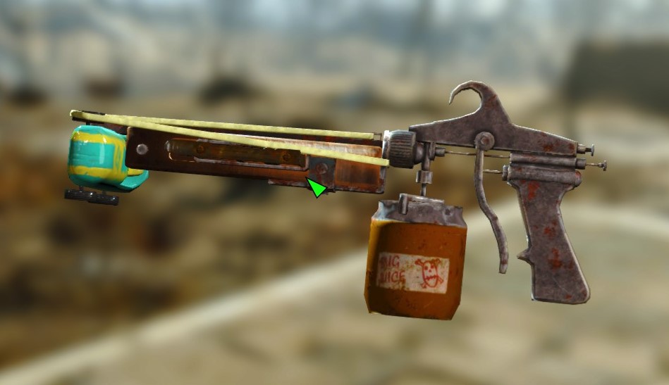 The dart gun is a player-crafted weapon which functions like a small pistol-crossbow. It can be assembled at any workbench by using at least one dart gun schematic, and the appropriate components. A paint gun serves as the framework for the gun, with the paint can containing the venom from a radscorpion poison gland. A toy car is used as the bow, with elastic surgical tubing attached to the car's wheels in order to propel the ammunition.