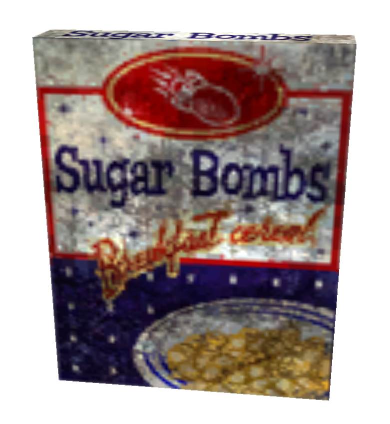 Sugar Bombs is a pre-War breakfast cereal that can be found all around the Wasteland, packaged in white and blue boxes with a red ovoid logo at the top, fully labeled as "Sugar Bombs breakfast cereal." Numerous promotional posters can be found posted on walls around the wasteland, touting the Sugar Bombs' "explosive great taste!" and some supposedly contain a "free Captain Cosmos decoder ring," though one has yet to be found. The cereal pieces themselves are modeled after atomic bombs, resembling the Fat Man, or perhaps more relevantly, a mini nuke.