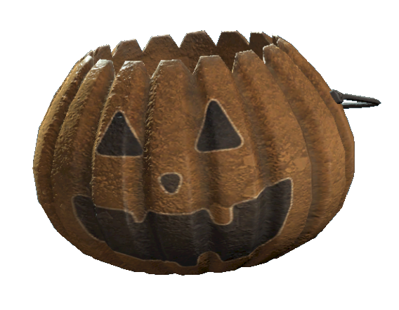 The plastic pumpkin is an orange bucket with a flexible overhead handle, which has been designed in the shape of a pumpkin. It has a stereotypical jack-o-lantern face, either transferred or painted onto one side. It can also spawn containing various pieces of "candy," such as bubblegum and gum drops.