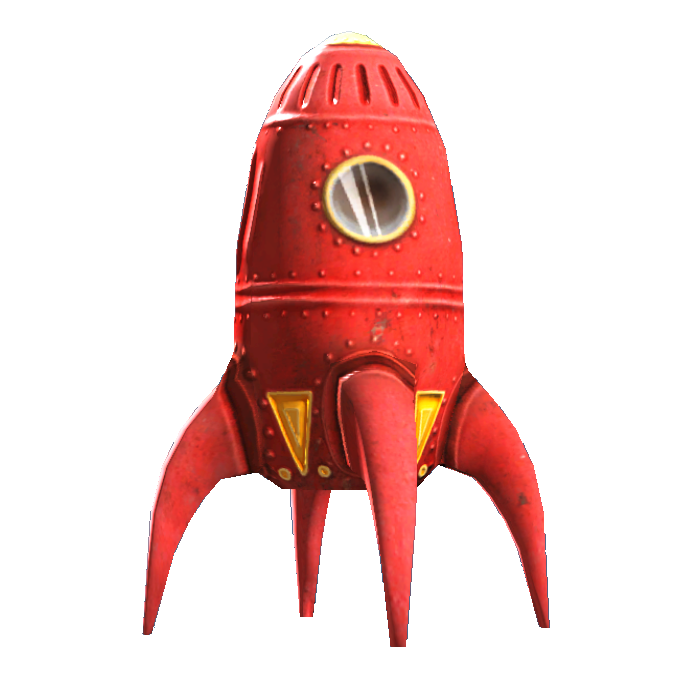 A small toy rocketship, made of aluminum and with a plastic shell. Its color is red, with yellow triangles on the bottom. Word count: 22