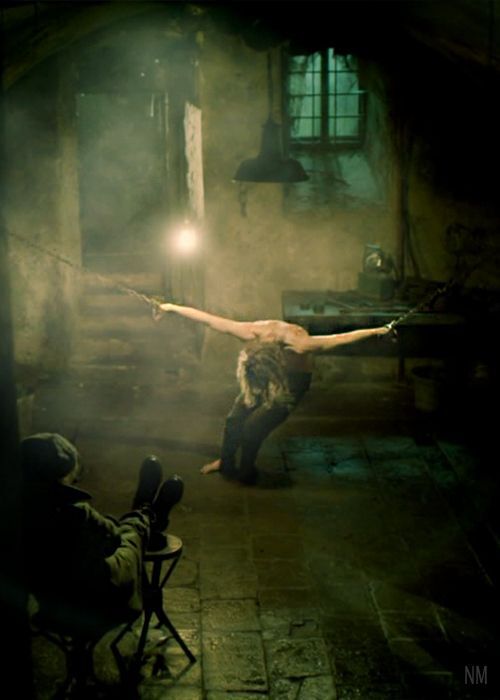 Cette odeur ignoble, cette épaisse brume saumâtre, ce sol meuble et cette vision d’horreur rendent la progression des Garous très difficile et surtout très éprouvante. Mais comme cela ne suffisait pas, l’ouie, le dernier de leur sens qui n’avait pas encore été sollicité par ce royaume abject, est soudain mis en éveil par les supplications, des cris de douleurs et des pleurs d’une femme. La brume épaisse se lève légèrement du sentier comme pour leurs permettent de voir la scène, une femme est enchainée par les bras, le dos nue elle supplie son bourreau de cesser les tortures. Le bourreau, un homme encapuchonné habillé entièrement de noir semble se délecter des souffrances de cette femme qu’il est en train de fouetter. Comme un peintre prendrai un léger recul pour admirer son œuvre ; il fait quelques pas en arrière, s’assoie sur une chaise et étant ses jambes dans un rire sadique.