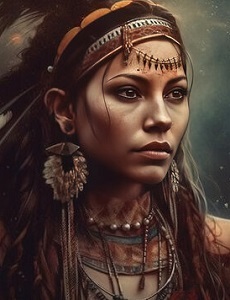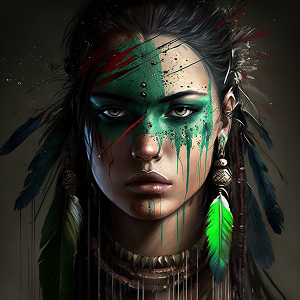Le Boss se posa alors sur la tête de Jojo et dans un éclair de lumière éblouissant se changea en une jeune femme magnifique. Elle avait le teint mat, des yeux aussi vert que les cristaux qui ornaient cet endroit, sa chevelure de jais tombaient en cascade sur ses épaules nues, son visage et son corps était peint de symboles tribaux de couleur vert émeraude eux aussi. Elle était habillé simplement et légèrement avec quelques bijoux nacré qui nous rappelèrent le pelage de Jojo. Deux plumes vertes disposées en boucle d’oreilles pendaient le long de son beau visage qui montrait une détermination et une force hors du commun. Il y avait de la noblesse et de l’intelligence dans cette femme digne et mystérieuse.