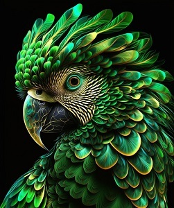 Plusieurs secousses créant des ondes sur le lac se mirent alors à secouer la cavité, et rapidement nous vîmes que l’eau si mit à bouillonner, prit soudainement de soubresauts et de remous. Une lumière verte apparut qui grandissait à mesure qu’elle remontait à la surface pour finalement voir sortir de l’eau, un grande bulle verdâtre qui éclata en étoile de gouttelettes scintillantes laissant apparaître un magnifique perroquet au plumage vert émeraude légèrement rehaussé d’or. Il était splendide et volait au dessus du lac pour enfin se poser sur une stalagmite située non loin de là.