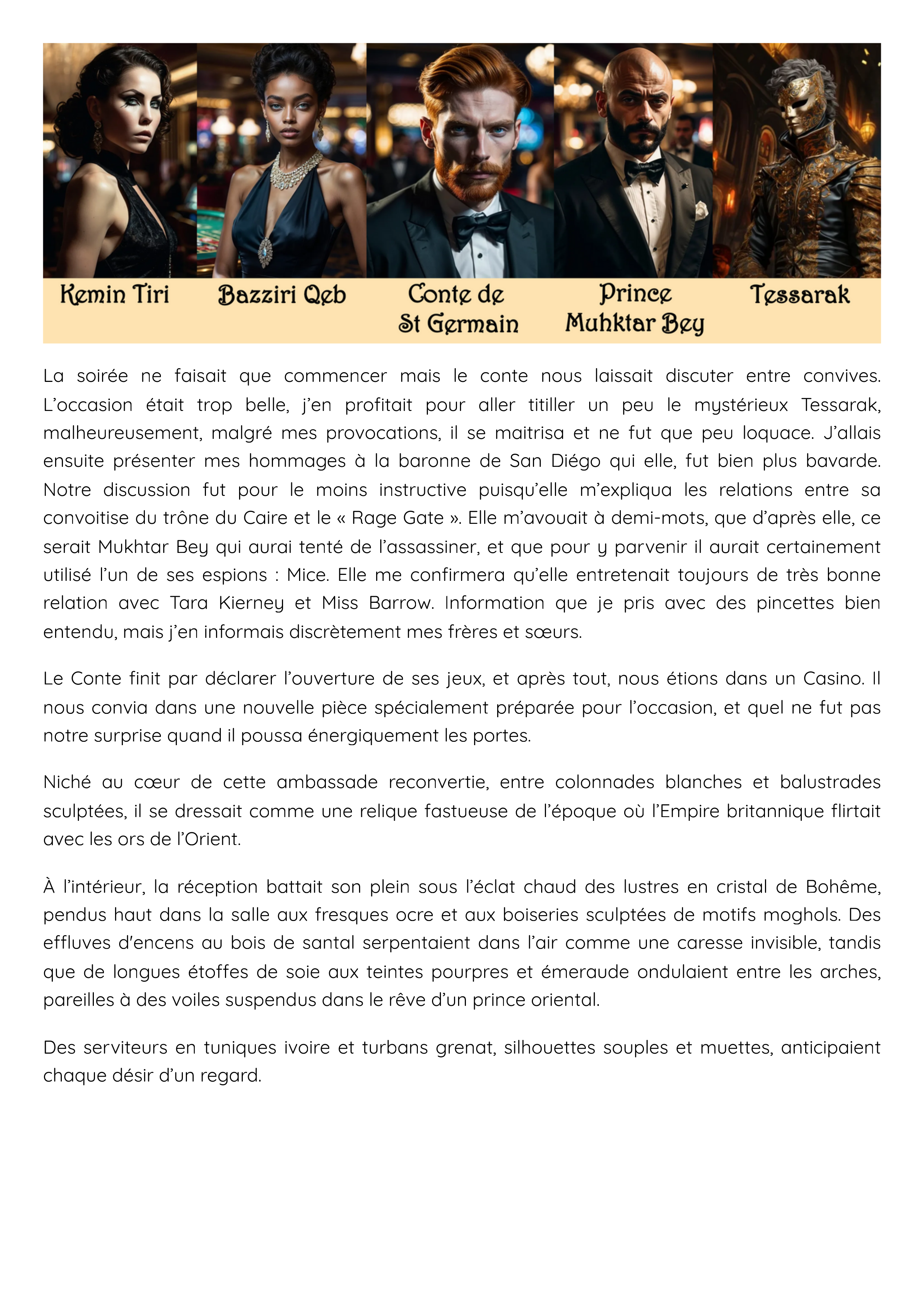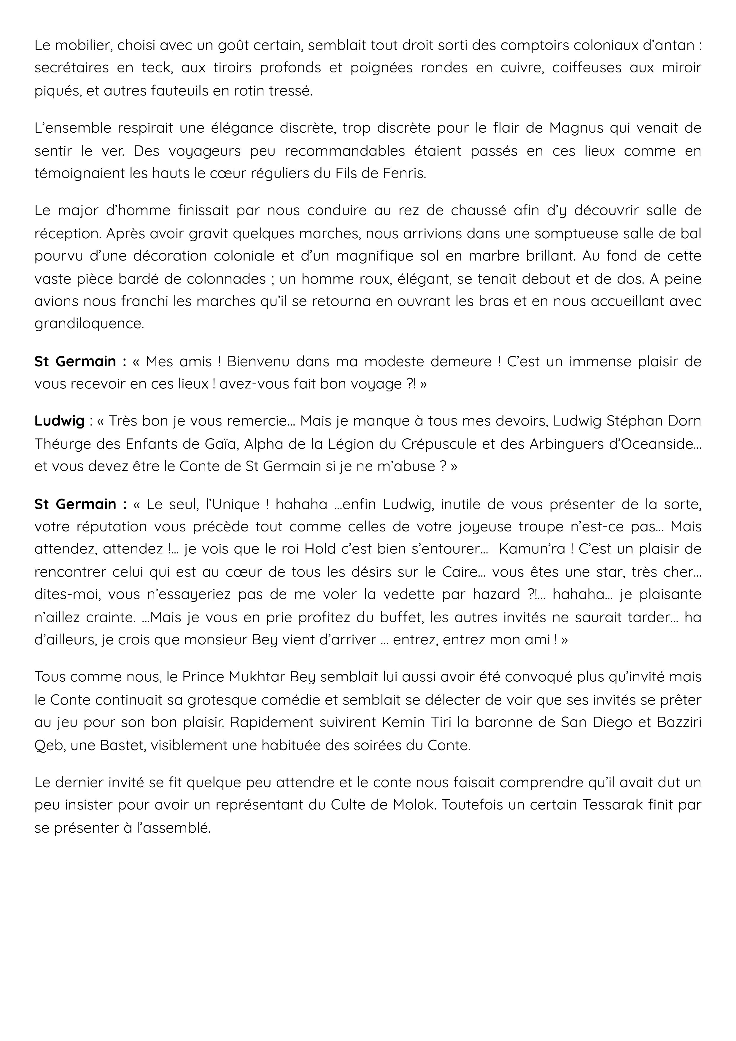 St Germain : « Le seul, l’Unique ! hahaha …enfin Ludwig, inutile de vous présenter de la sorte, votre réputation vous précède tout comme celles de votre joyeuse troupe n’est-ce pas… Mais attendez, attendez !... je vois que le roi Hold c’est bien s’entourer… Kamun’ra ! C’est un plaisir de rencontrer celui qui est au cœur de tous les désirs sur le Caire… vous êtes une star, très cher… dites-moi, vous n’essayeriez pas de me voler la vedette par hazard ?!… hahaha… je plaisante n’aillez crainte. …Mais je vous en prie profitez du buffet, les autres invités ne saurait tarder… ha d’ailleurs, je crois que monsieur Bey vient d’arriver … entrez, entrez mon ami ! »
