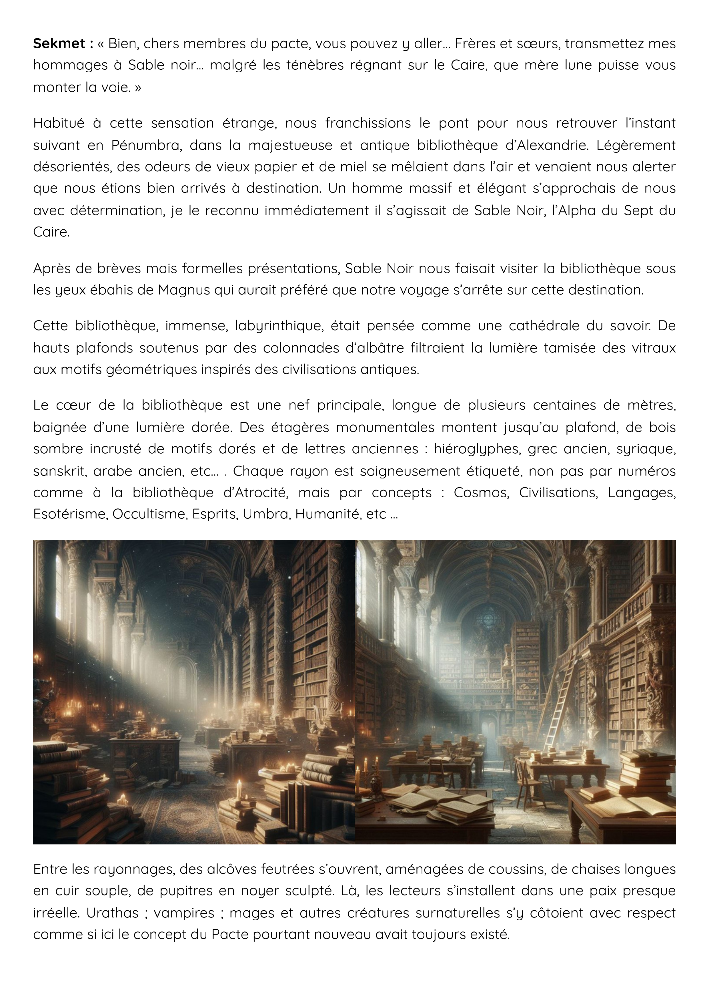 Habitué à cette sensation étrange, nous franchissions le pont pour nous retrouver l’instant suivant en Pénumbra, dans la majestueuse et antique bibliothèque d’Alexandrie. Légèrement désorientés, des odeurs de vieux papier et de miel se mêlaient dans l’air et venaient nous alerter que nous étions bien arrivés à destination. Un homme massif et élégant s’approchais de nous avec détermination, je le reconnu immédiatement il s’agissait de Sable Noir, l’Alpha du Sept du Caire.