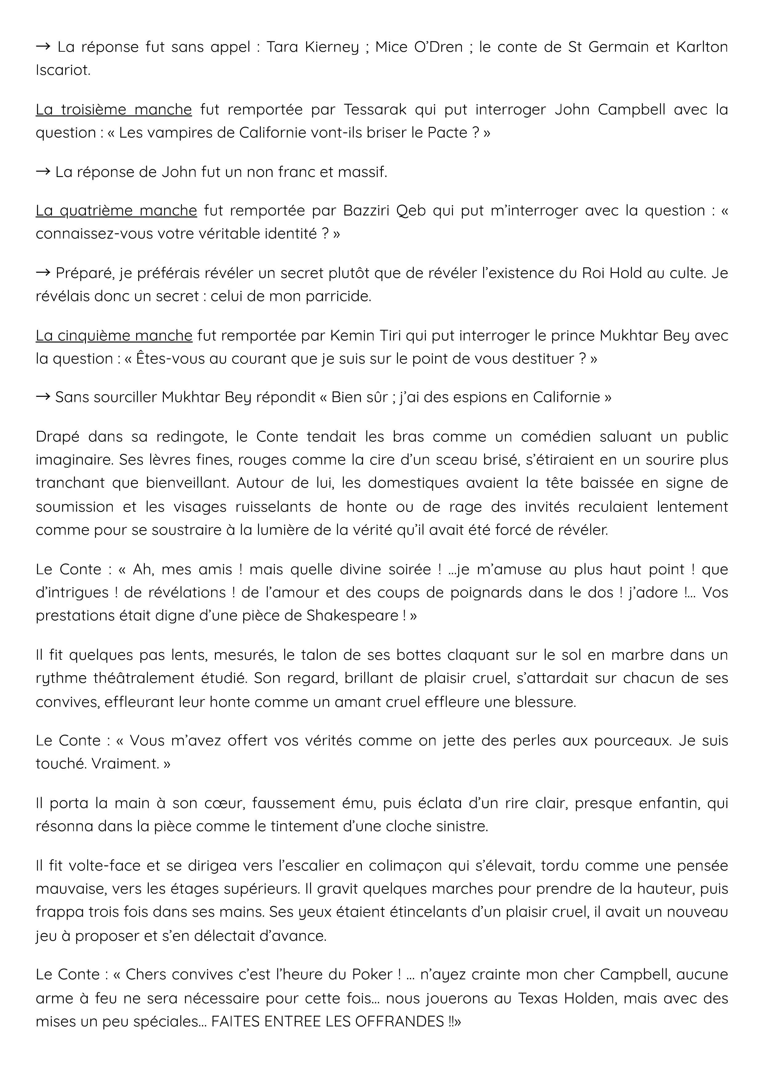 Le Conte : « Chers convives c’est l’heure du Poker ! … n’ayez crainte mon cher Campbell, aucune arme à feu ne sera nécessaire pour cette fois… nous jouerons au Texas Holden, mais avec des mises un peu spéciales… FAITES ENTREE LES OFFRANDES !!»