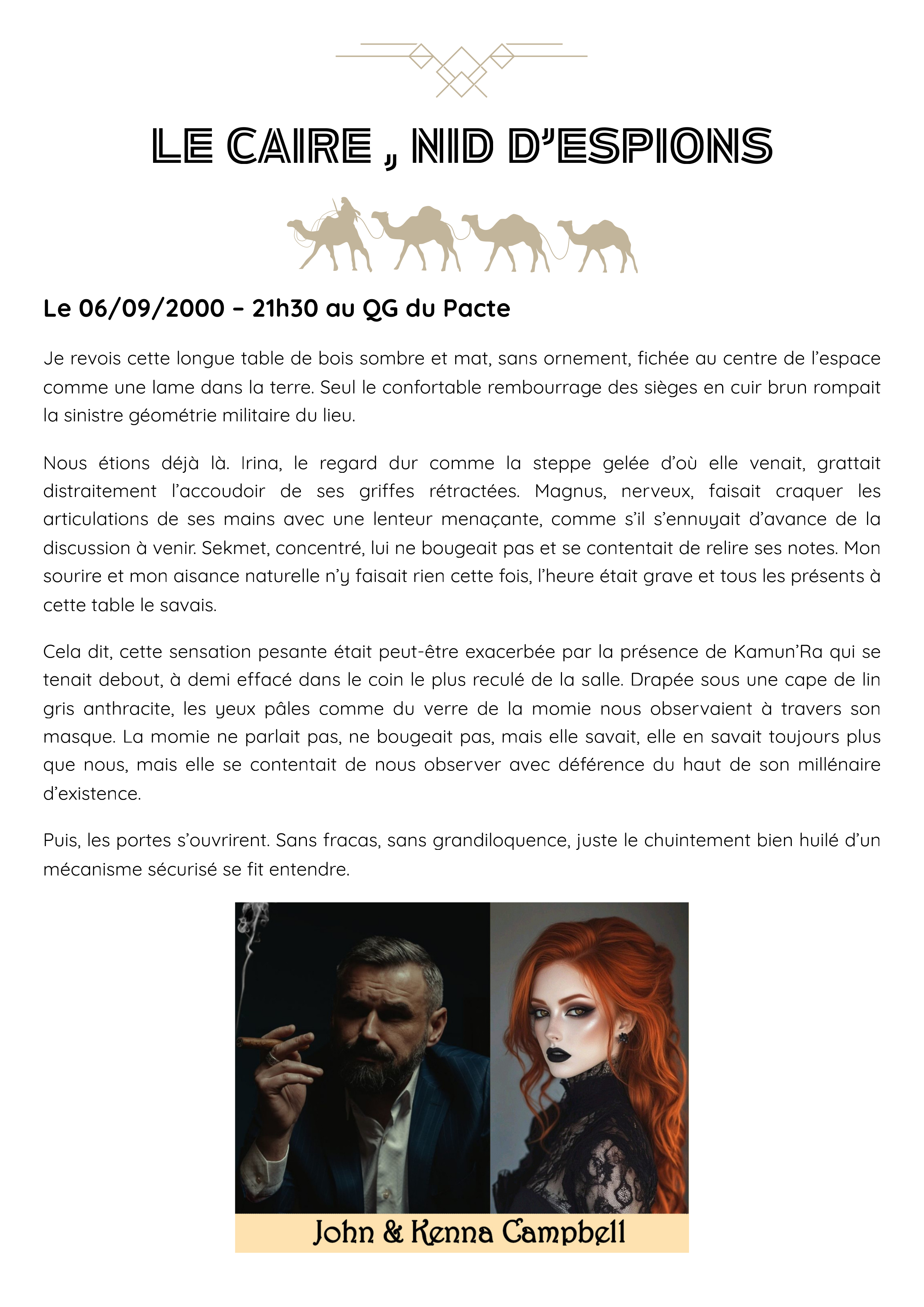 Par la présente, votre présence est requise au Caire, au cœur de la cité éternelle, là où les vents du désert murmurent encore des secrets plus anciens que vos lignées. Un lieu vous y attend : le London Club Cairo Casino. En plein jour, il n’est qu’un écrin doré pour fortunes frivoles, mais à la tombée de la nuit, ses murs résonnent des échos d’un autre monde, celui des Sociétés Occultes & secrètes, de pactes non écrits, de vérités cachées derrière des regards enfiévrés et des sourires carnassiers. Pas une partie de cartes. Pas un jeu de hasard. Non… quelque chose de plus vaste, de plus ancien, de plus délicieux. Un jeu dont les règles ont été gravées bien avant la mémoire du sang. Et vous avez été choisis pour y jouer. Choisis… ou désignés. Car il n’y a plus d’alternative. Vous viendrez.