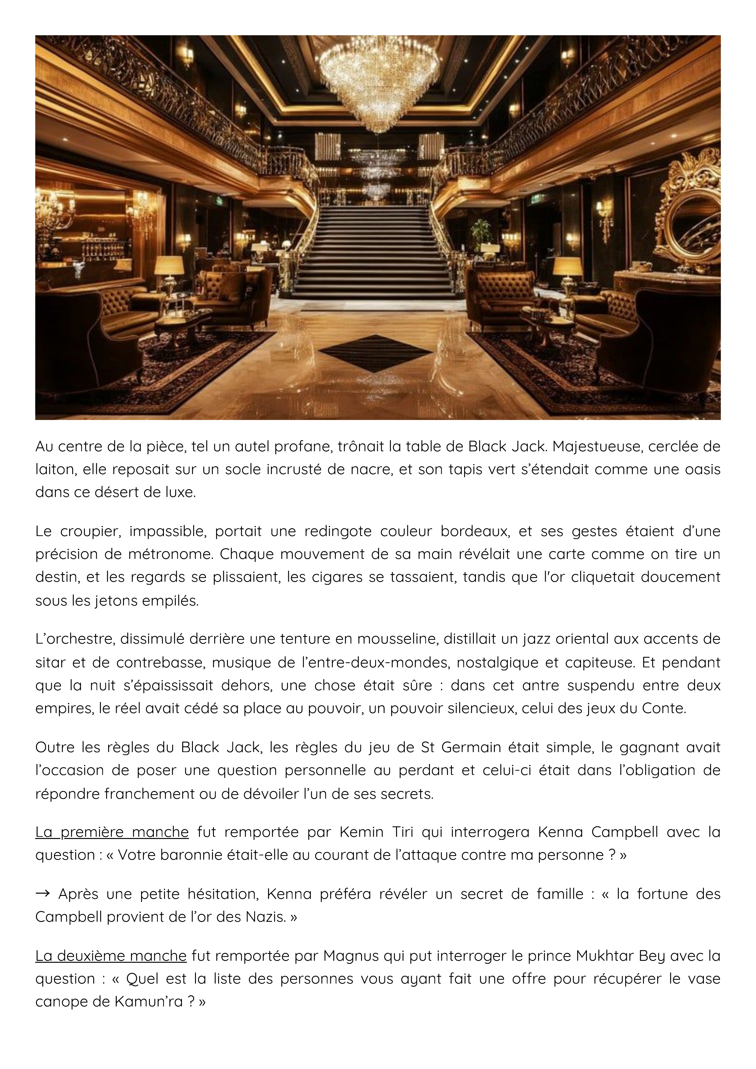 L’orchestre, dissimulé derrière une tenture en mousseline, distillait un jazz oriental aux accents de sitar et de contrebasse, musique de l’entre-deux-mondes, nostalgique et capiteuse. Et pendant que la nuit s’épaississait dehors, une chose était sûre : dans cet antre suspendu entre deux empires, le réel avait cédé sa place au pouvoir, un pouvoir silencieux, celui des jeux du Conte.