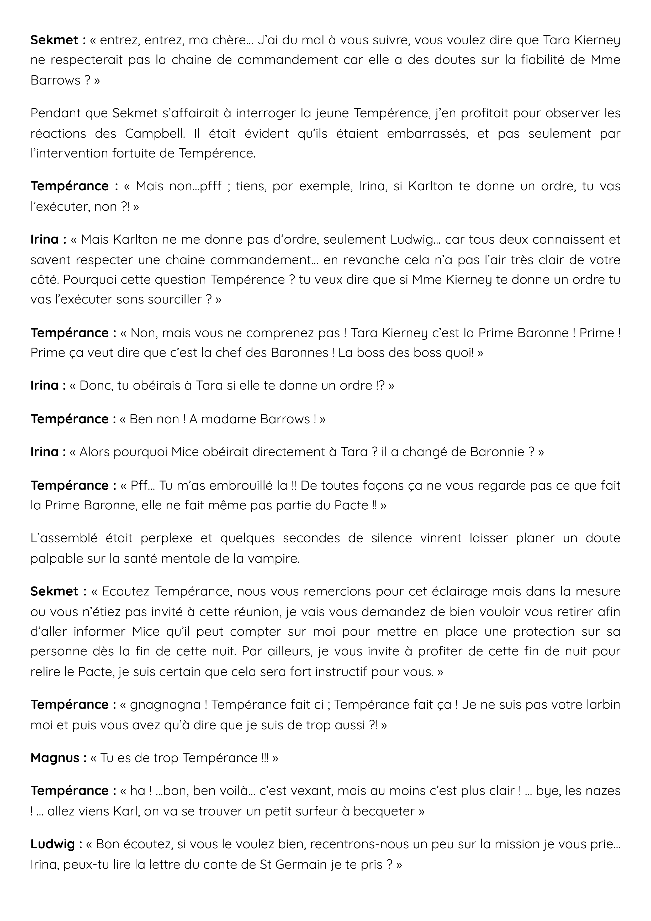 Sekmet : « Ecoutez Tempérance, nous vous remercions pour cet éclairage mais dans la mesure ou vous n’étiez pas invité à cette réunion, je vais vous demandez de bien vouloir vous retirer afin d’aller informer Mice qu’il peut compter sur moi pour mettre en place une protection sur sa personne dès la fin de cette nuit. Par ailleurs, je vous invite à profiter de cette fin de nuit pour relire le Pacte, je suis certain que cela sera fort instructif pour vous. »