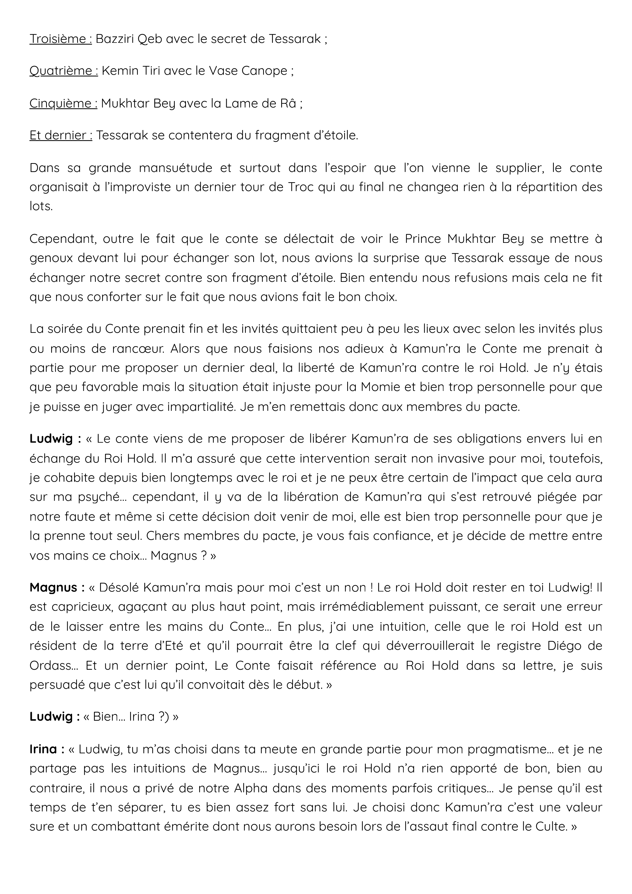 Irina : « Ludwig, tu m’as choisi dans ta meute en grande partie pour mon pragmatisme… et je ne partage pas les intuitions de Magnus… jusqu’ici le roi Hold n’a rien apporté de bon, bien au contraire, il nous a privé de notre Alpha dans des moments parfois critiques… Je pense qu’il est temps de t’en séparer, tu es bien assez fort sans lui. Je choisi donc Kamun’ra c’est une valeur sure et un combattant émérite dont nous aurons besoin lors de l’assaut final contre le Culte. »