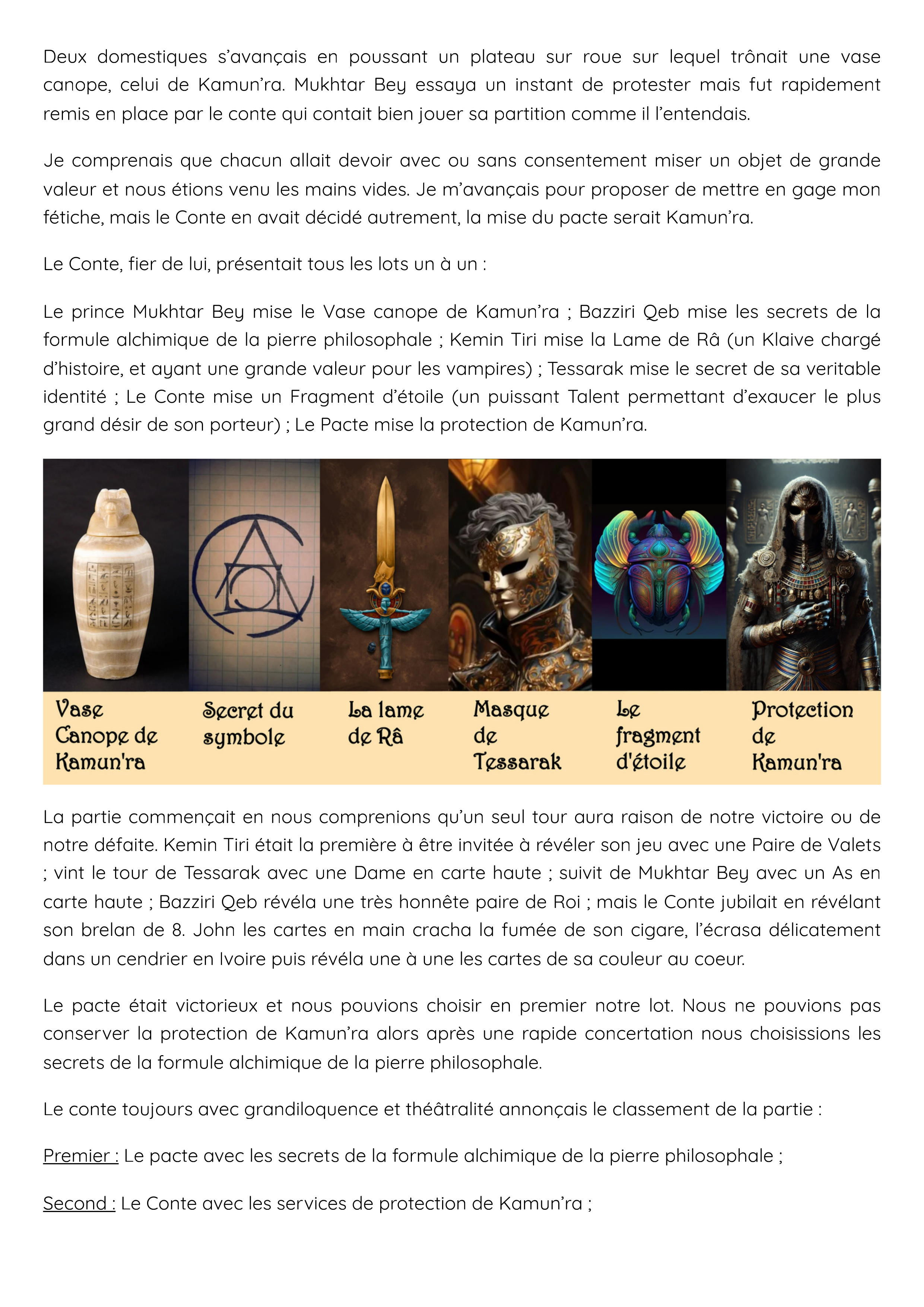 Je comprenais que chacun allait devoir avec ou sans consentement miser un objet de grande valeur et nous étions venu les mains vides. Je m’avançais pour proposer de mettre en gage mon fétiche, mais le Conte en avait décidé autrement, la mise du pacte serait Kamun’ra.