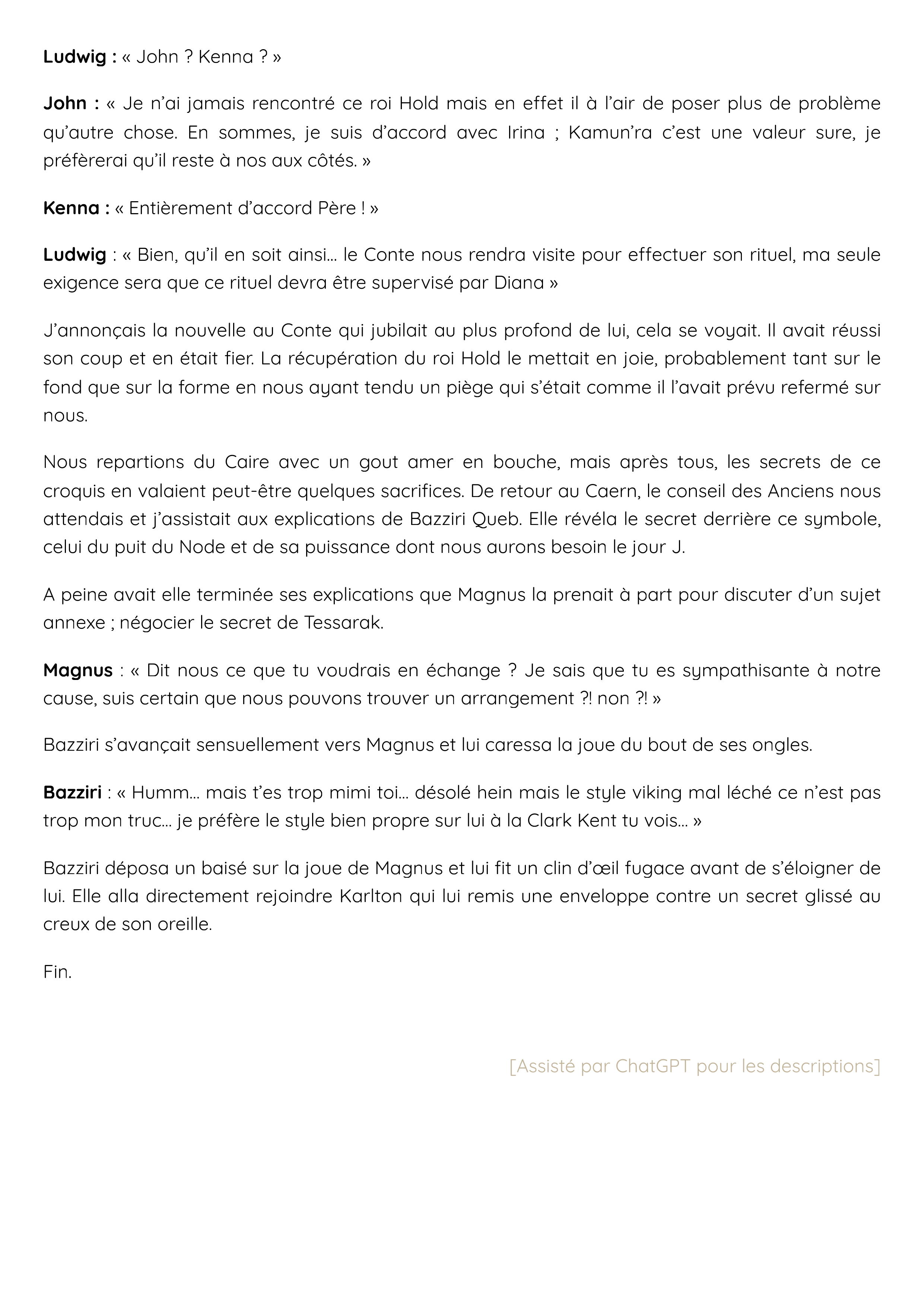 Bazziri déposa un baisé sur la joue de Magnus et lui fit un clin d’œil fugace avant de s’éloigner de lui. Elle alla directement rejoindre Karlton qui lui remis une enveloppe contre un secret glissé au creux de son oreille.