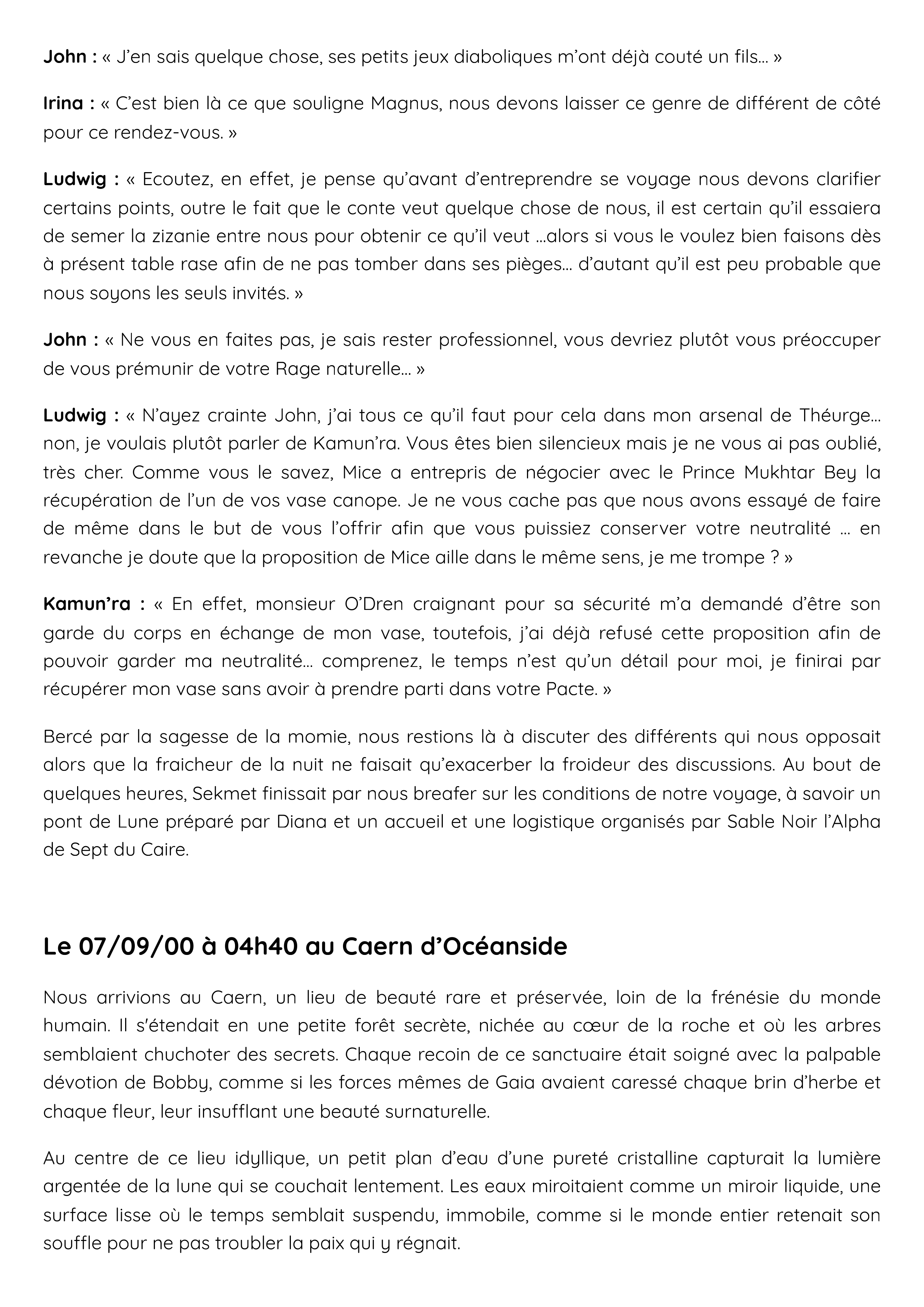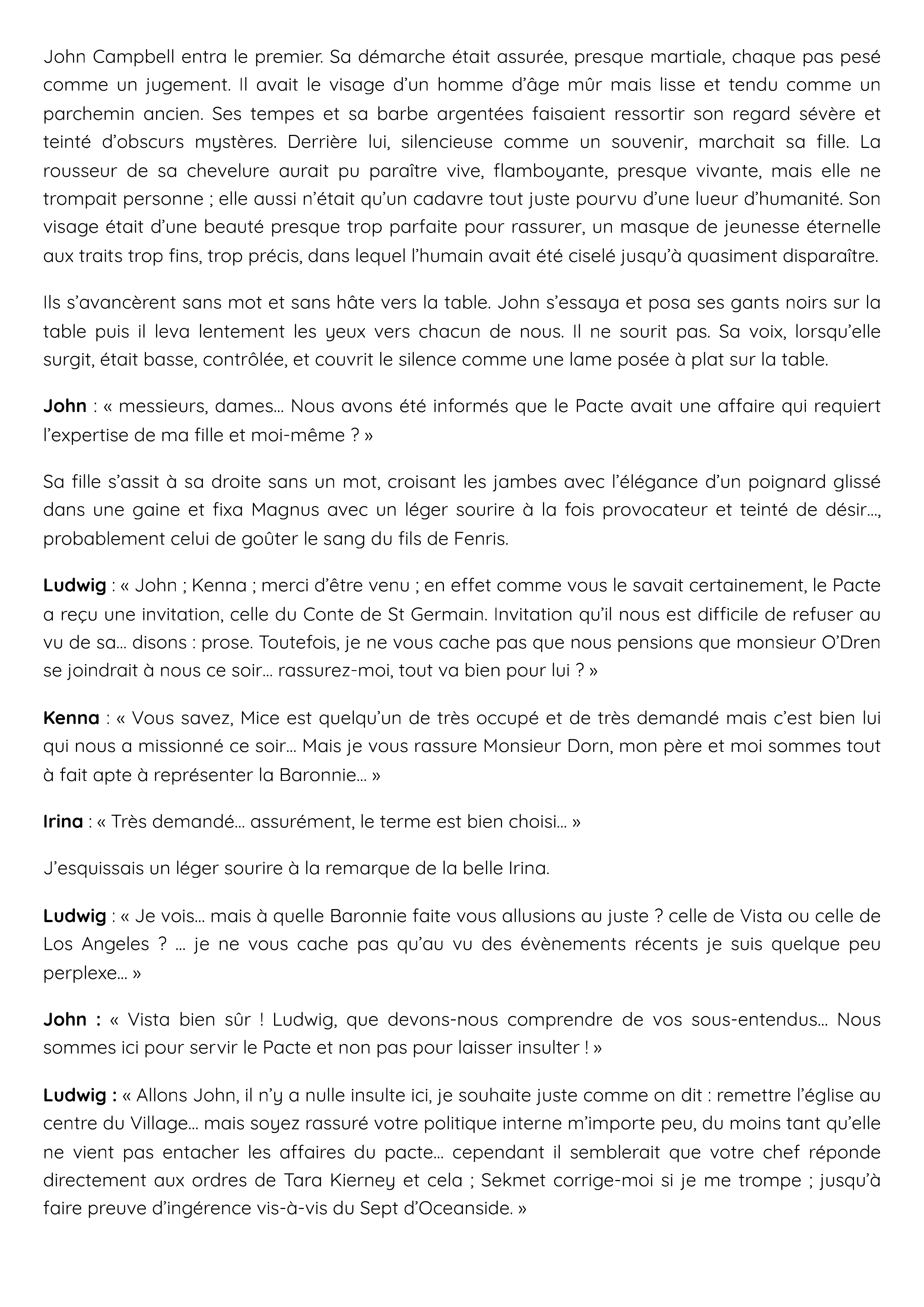 Ludwig : « John ; Kenna ; merci d’être venu ; en effet comme vous le savait certainement, le Pacte a reçu une invitation, celle du Conte de St Germain. Invitation qu’il nous est difficile de refuser au vu de sa… disons : prose. Toutefois, je ne vous cache pas que nous pensions que monsieur O’Dren se joindrait à nous ce soir… rassurez-moi, tout va bien pour lui ? »