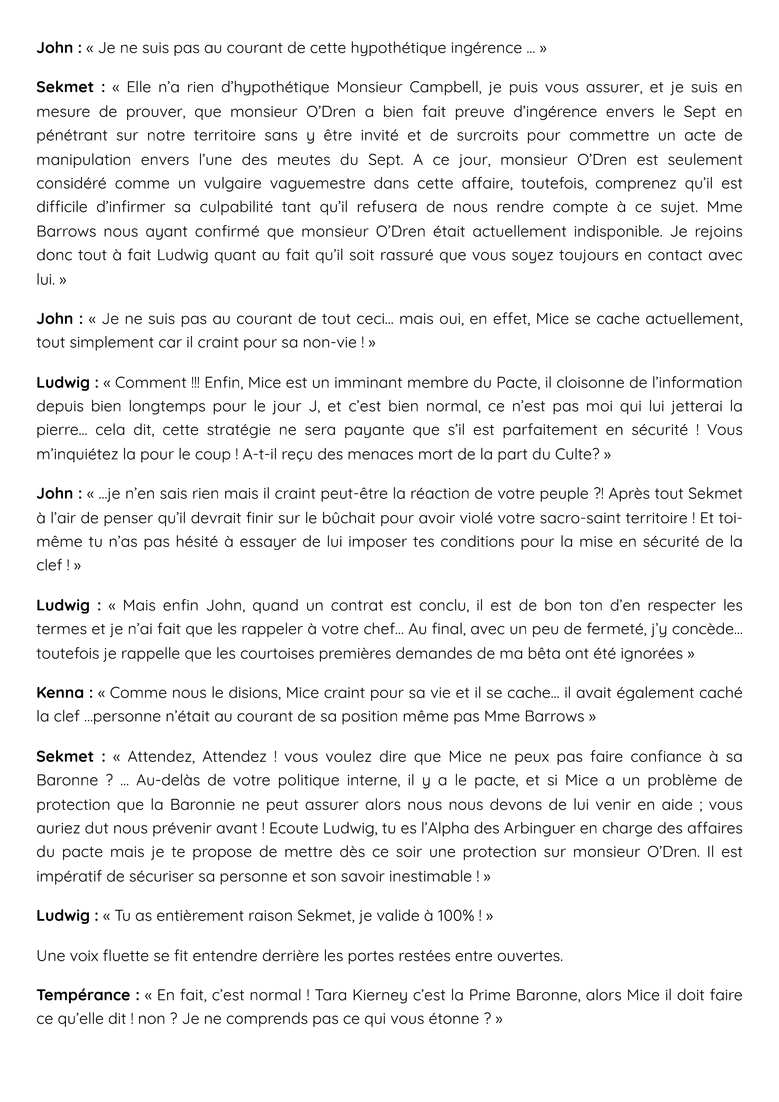 Sekmet : « Attendez, Attendez ! vous voulez dire que Mice ne peux pas faire confiance à sa Baronne ? … Au-delàs de votre politique interne, il y a le pacte, et si Mice a un problème de protection que la Baronnie ne peut assurer alors nous nous devons de lui venir en aide ; vous auriez dut nous prévenir avant ! Ecoute Ludwig, tu es l’Alpha des Arbinguer en charge des affaires du pacte mais je te propose de mettre dès ce soir une protection sur monsieur O’Dren. Il est impératif de sécuriser sa personne et son savoir inestimable ! »