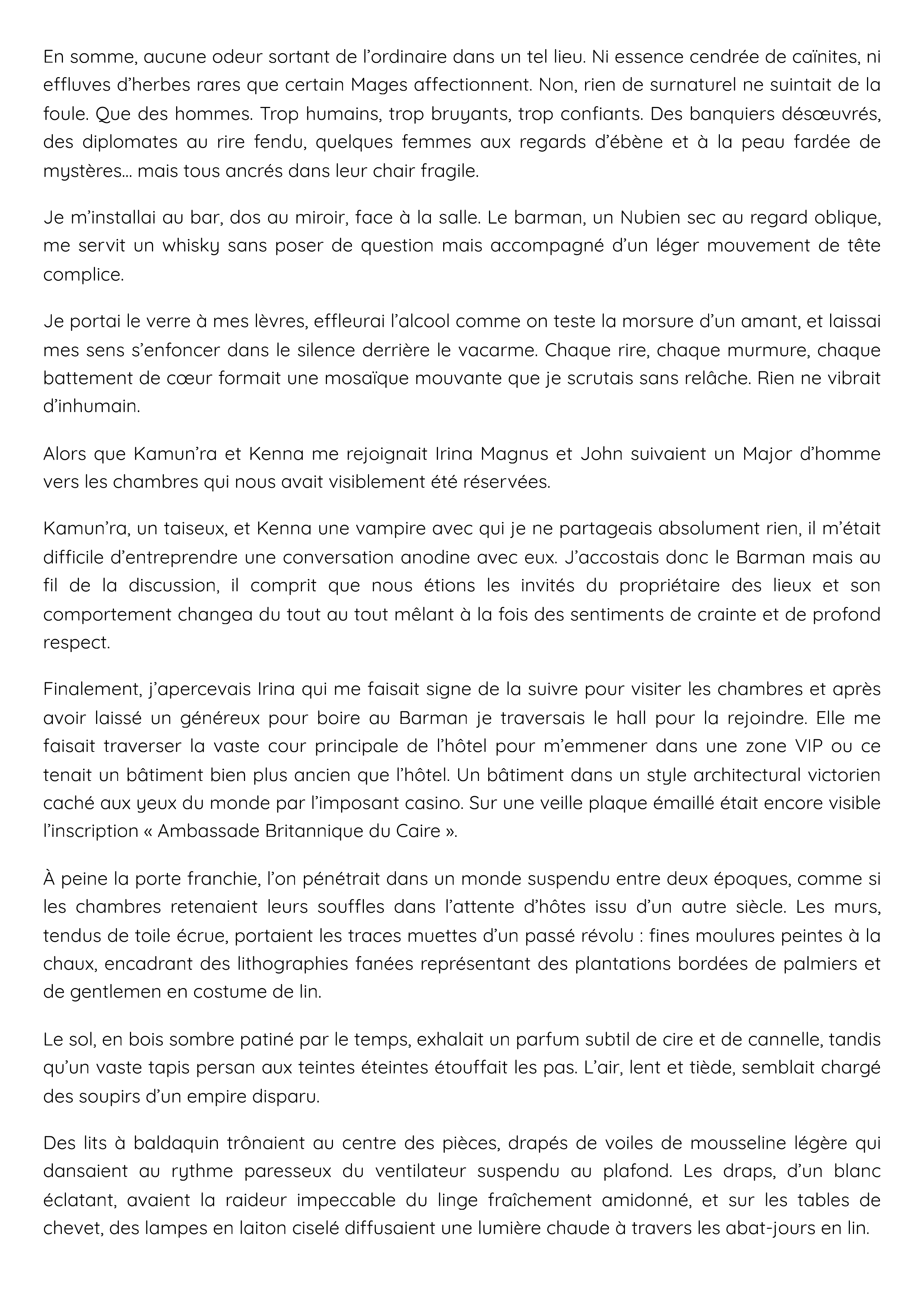 Finalement, j’apercevais Irina qui me faisait signe de la suivre pour visiter les chambres et après avoir laissé un généreux pour boire au Barman je traversais le hall pour la rejoindre. Elle me faisait traverser la vaste cour principale de l’hôtel pour m’emmener dans une zone VIP ou ce tenait un bâtiment bien plus ancien que l’hôtel. Un bâtiment dans un style architectural victorien caché aux yeux du monde par l’imposant casino. Sur une veille plaque émaillé était encore visible l’inscription « Ambassade Britannique du Caire ».