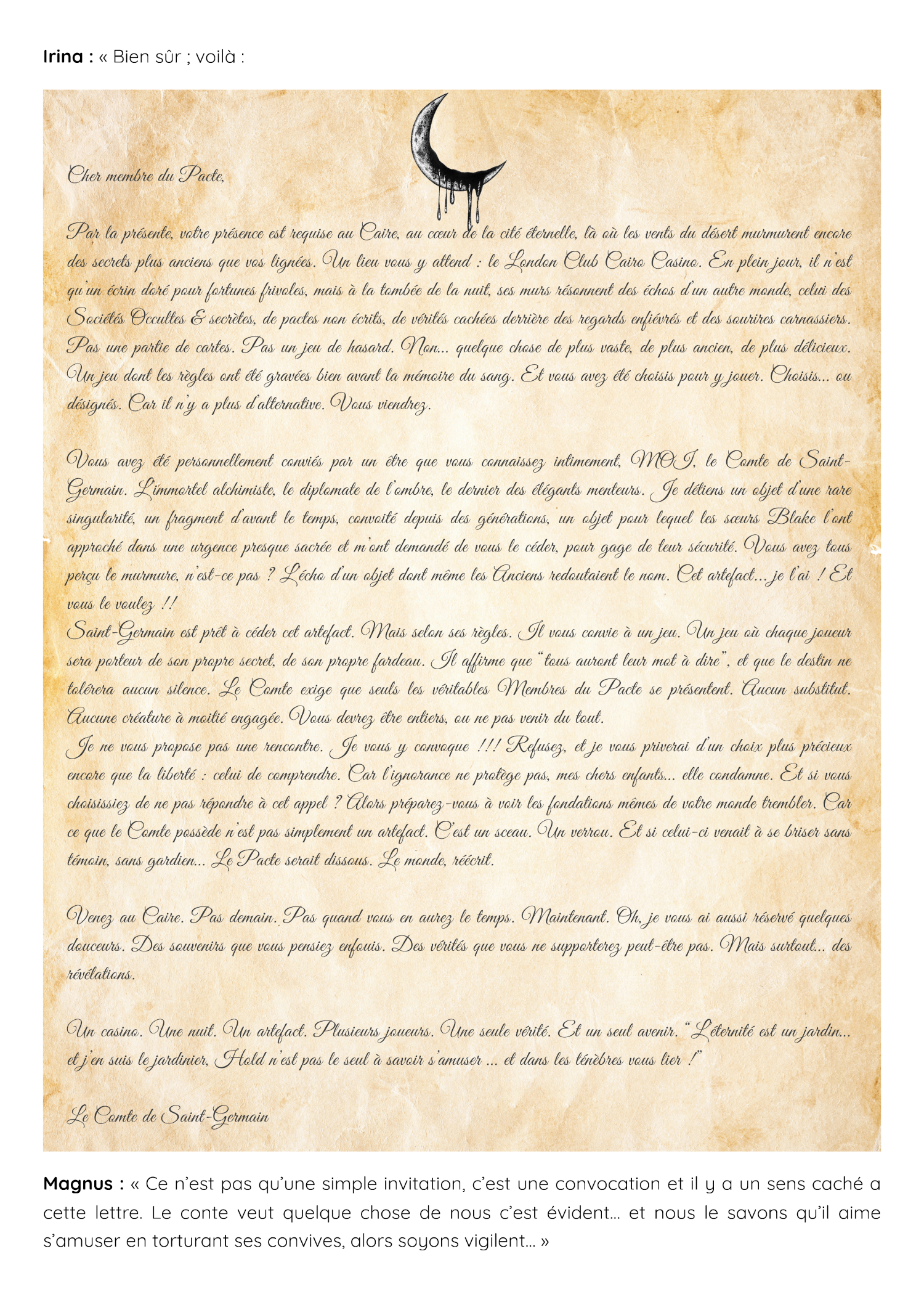 Saint-Germain est prêt à céder cet artefact. Mais selon ses règles. Il vous convie à un jeu. Un jeu où chaque joueur sera porteur de son propre secret, de son propre fardeau. Il affirme que “tous auront leur mot à dire”, et que le destin ne tolérera aucun silence. Le Comte exige que seuls les véritables Membres du Pacte se présentent. Aucun substitut. Aucune créature à moitié engagée. Vous devrez être entiers, ou ne pas venir du tout.