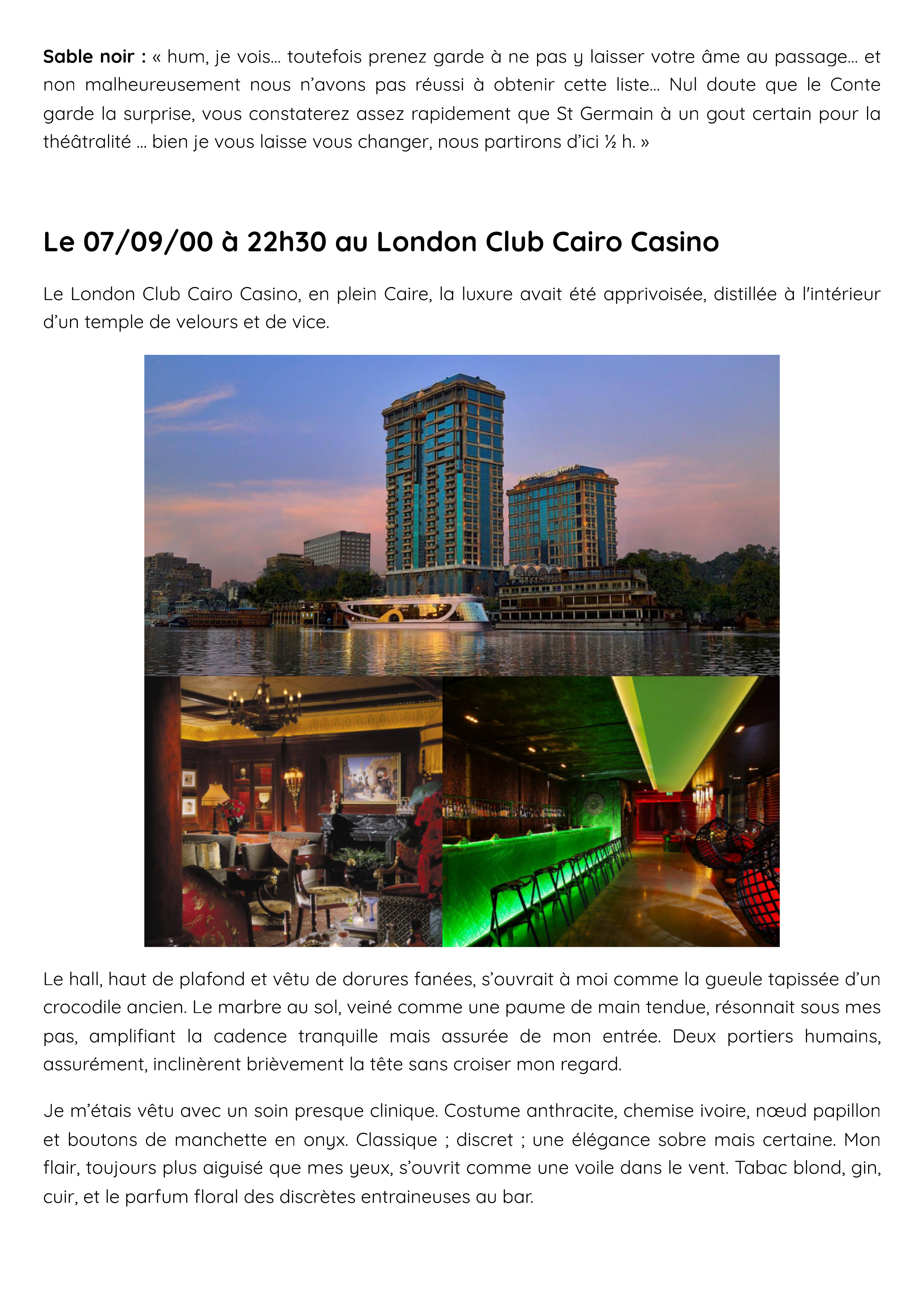 Le London Club Cairo Casino, en plein Caire, la luxure avait été apprivoisée, distillée à l'intérieur d’un temple de velours et de vice.